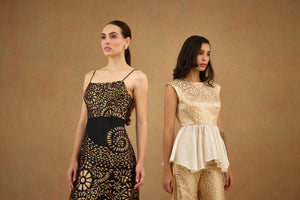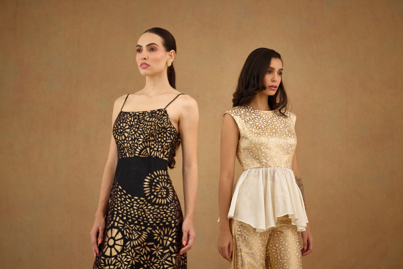 This black and white velvet set features a laser-cut sleeveless halter neck top paired with a matching skirt. The skirt is detailed with an eyelet tie-up on the front side, adding a refined, adjustable fit. Crafted for both style and comfort, this ensemble offers a sophisticated look ideal for contemporary occasions.
