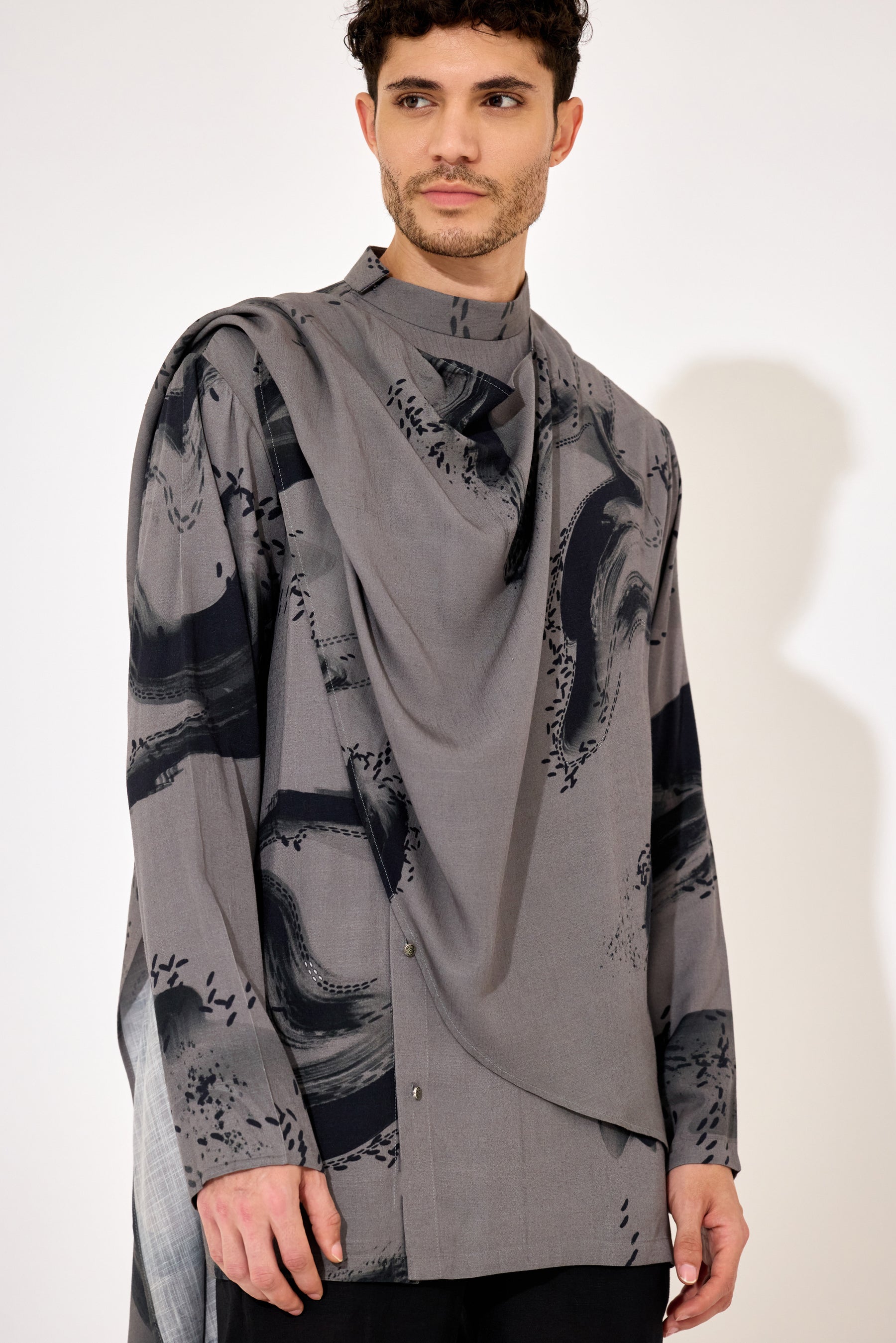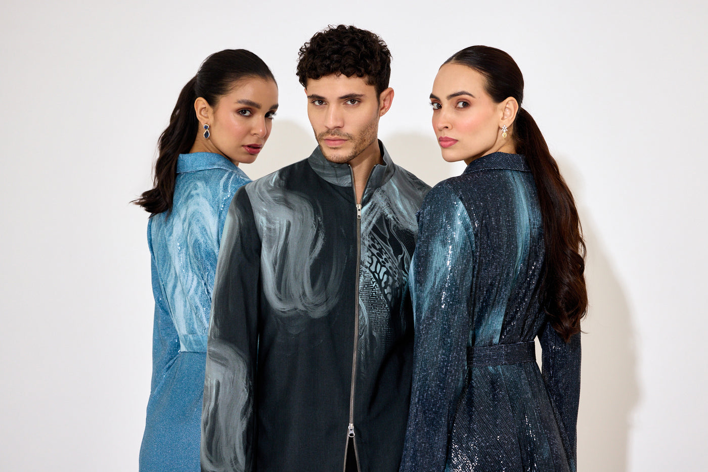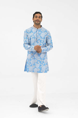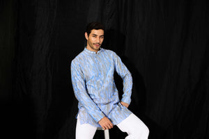 the morphe blue kurta with its subtle swirl print and sharp straight band brings timeless charm to the singer’s presence.