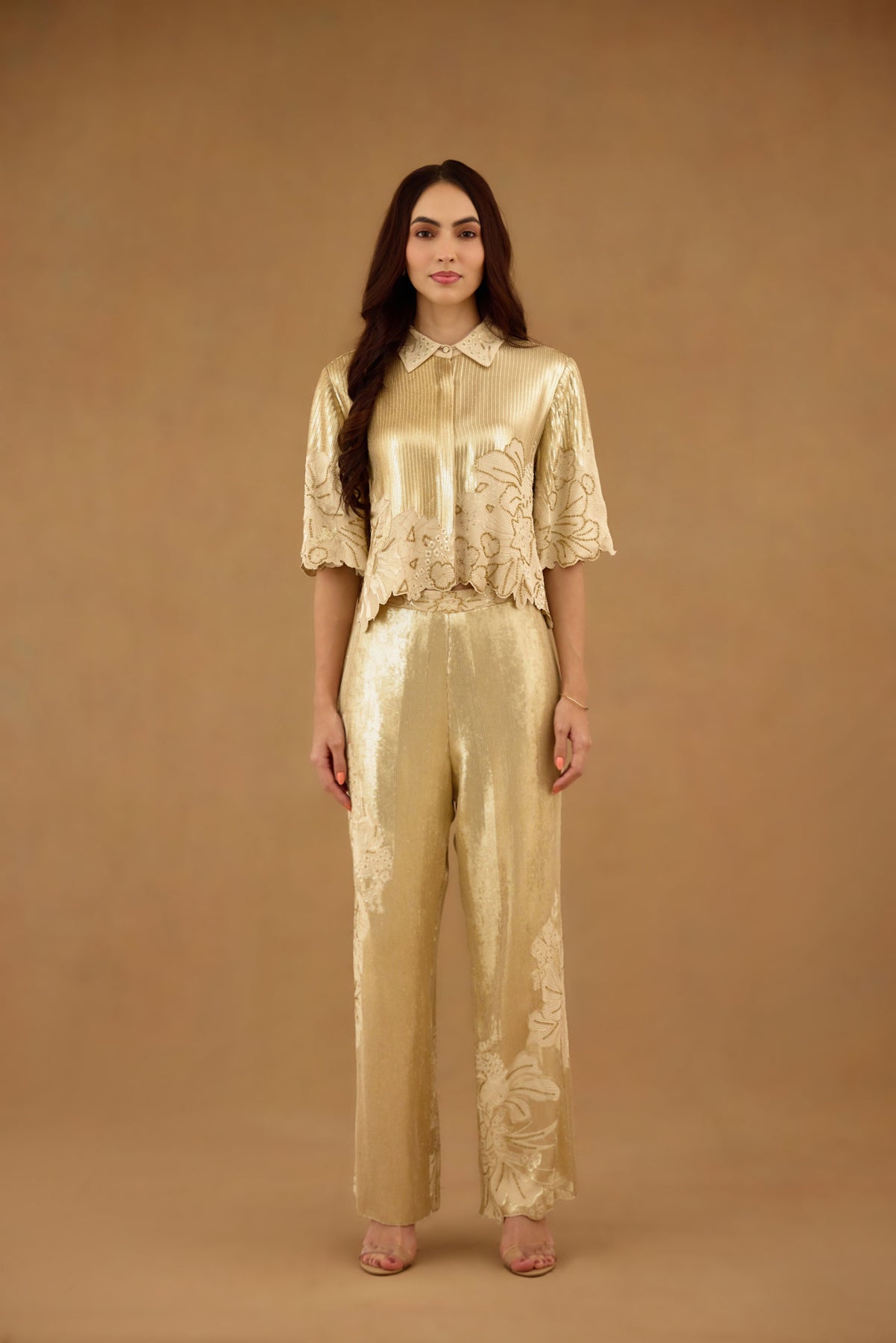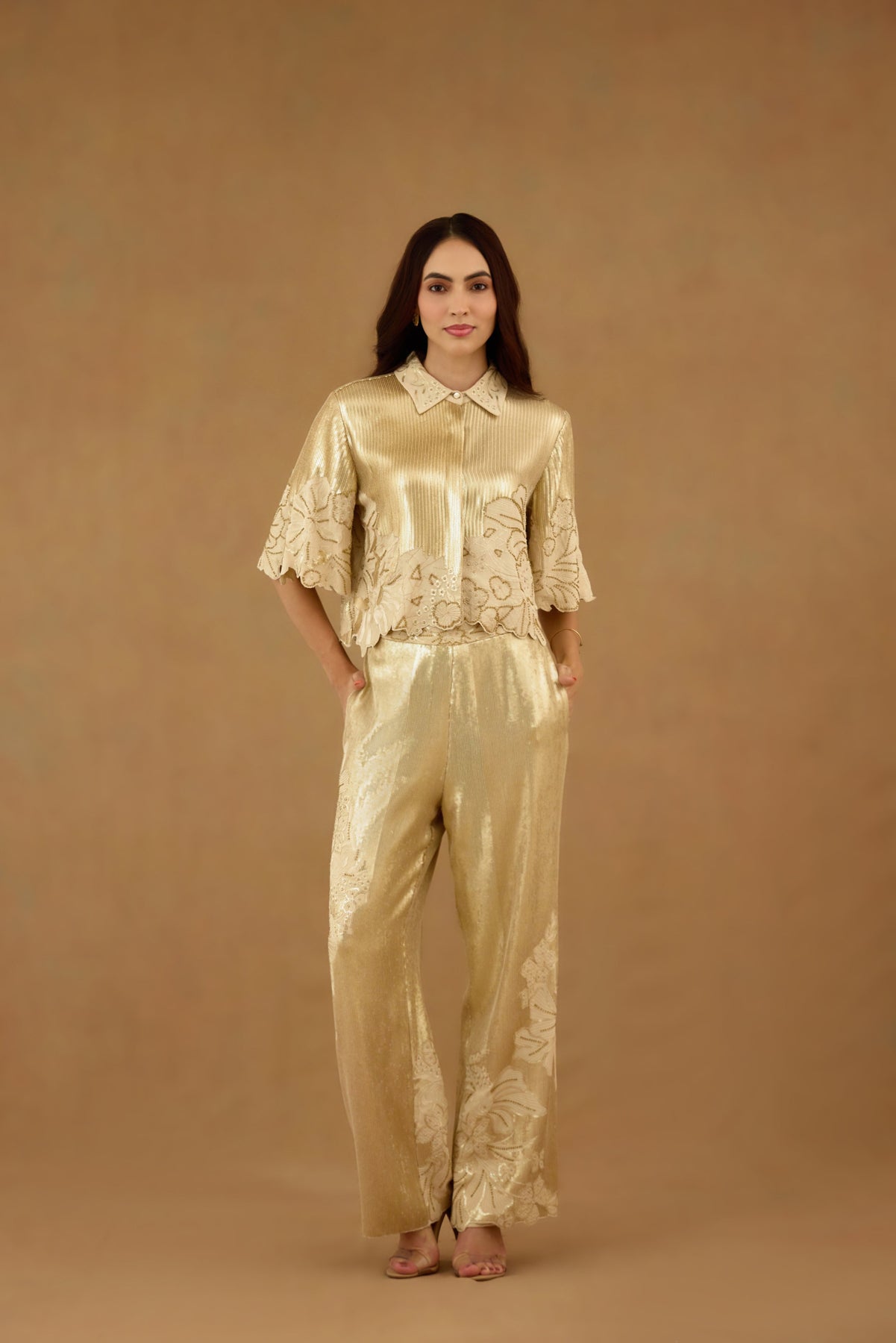 Elevate your wardrobe with this exquisite golden sequin embroidered pant, meticulously crafted for a refined look. Featuring intricate floral embroidery enhanced by delicate hand embellishments, this straight fit  style combines elegance with artisanal craftsmanship. Perfect for occasions that call for subtle glamour, it offers both sophistication and comfort through its structured yet breathable design. A statement piece that seamlessly blends traditional artistry with contemporary fashion sensibility.
