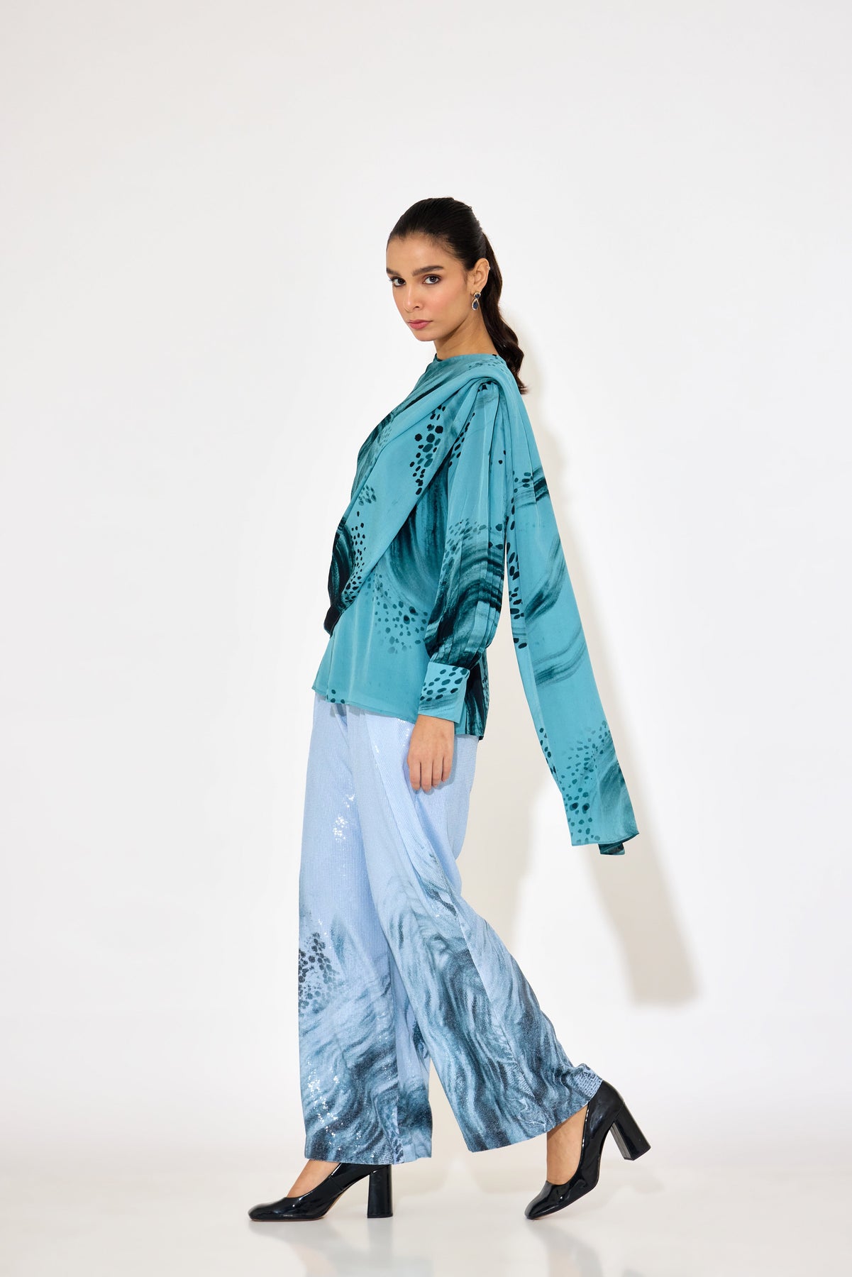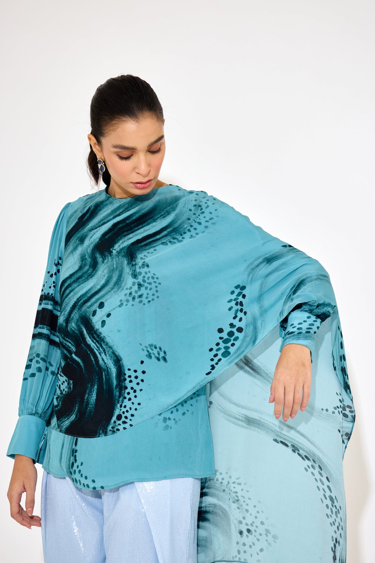 Elevate your wardrobe with this turquoise blue drape top featuring an abstract print that blends contemporary style with effortless elegance. Designed for a flattering fit, the soft draped fabric enhances movement and comfort, making it ideal for both casual outings and refined occasions. Its vibrant hue and unique pattern add a distinctive touch, perfect for those who appreciate expert tailoring and sophisticated design.
