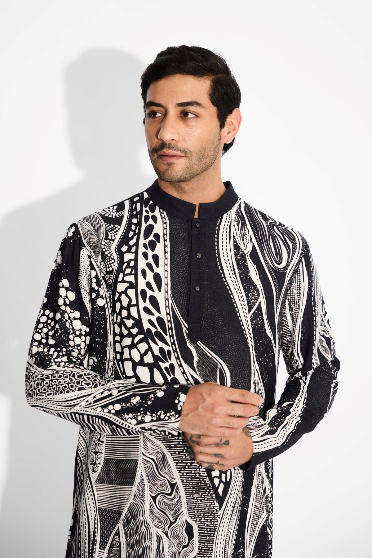 Color: BlackGarment Category: Menswear kurtaFabric: Tussar ViscoseFit: Regular fit Washcare: Dry clean only