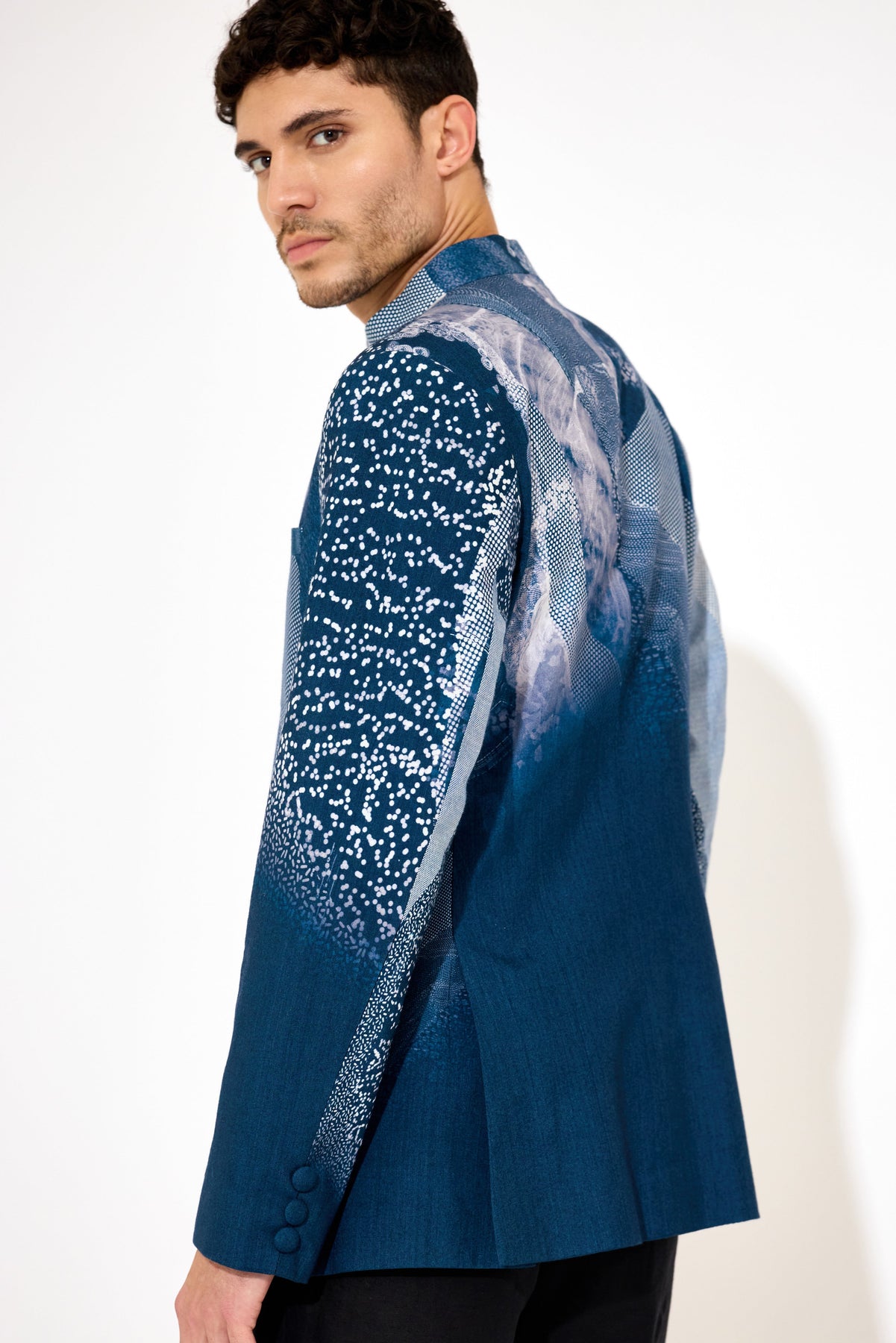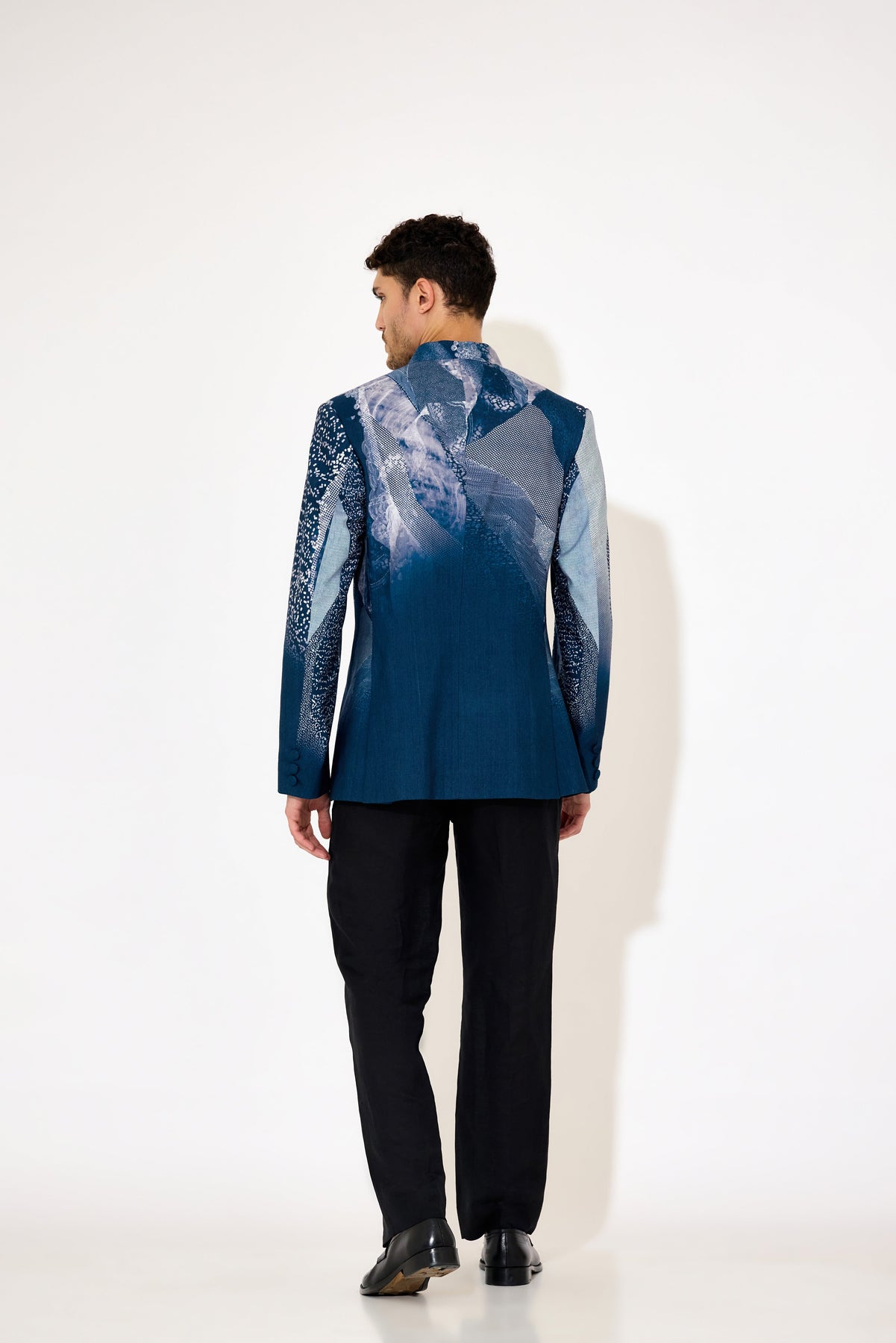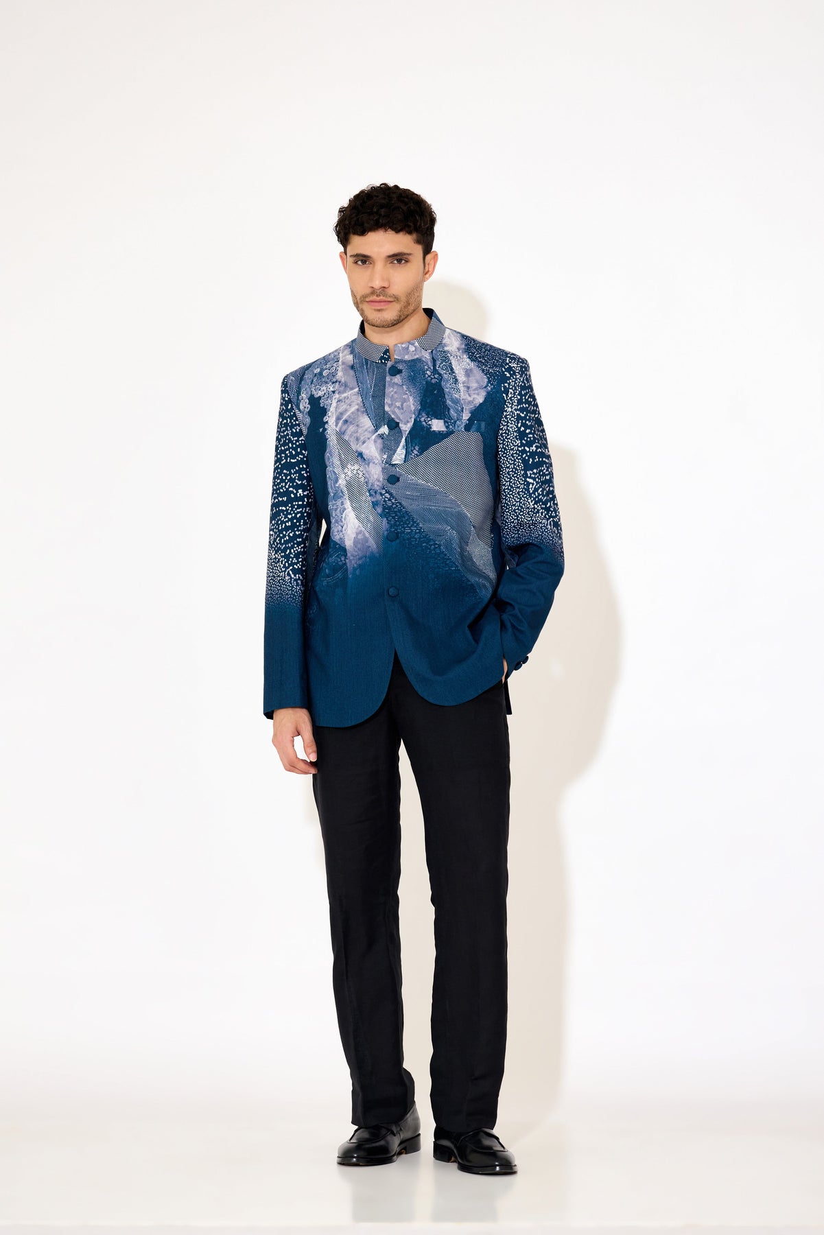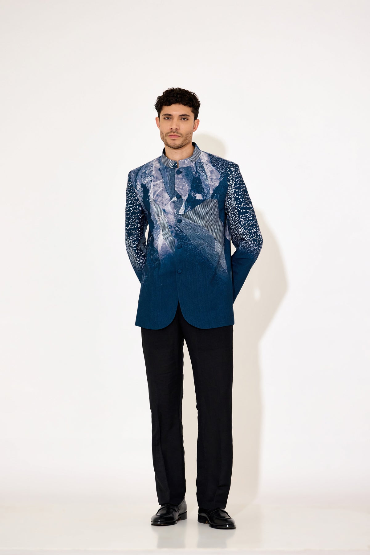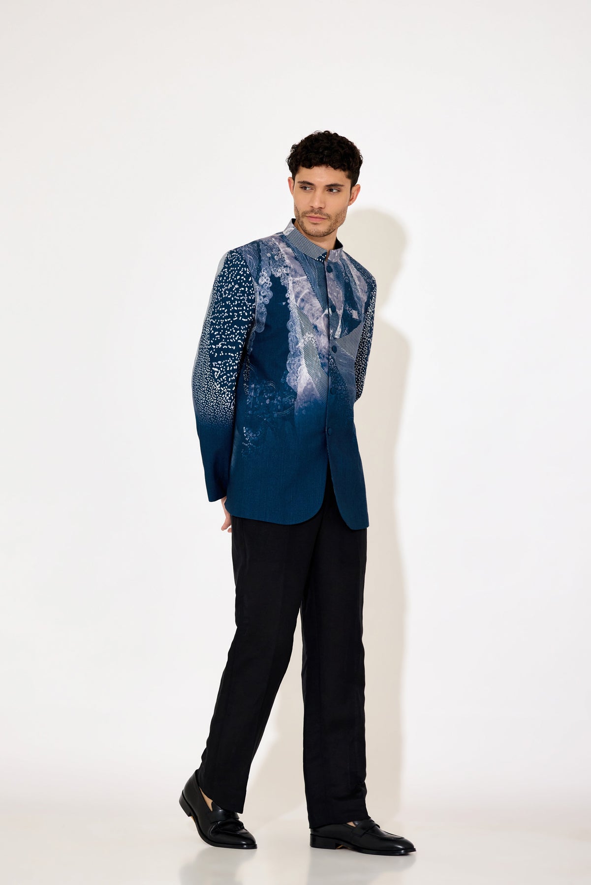 Elevate your formal wardrobe with this navy blue bandgala, designed to combine classic elegance with modern style. Crafted with precision, its tailored fit and intricate print detail add a refined touch suitable for weddings, formal events, or professional settings. The structured silhouette ensures a sharp appearance while maintaining comfort, making it an essential piece for the discerning gentleman.