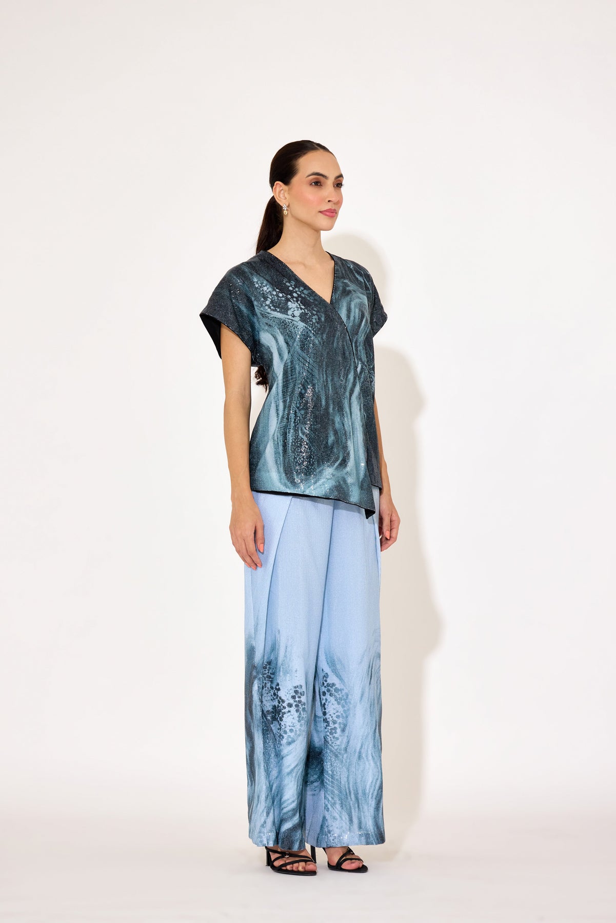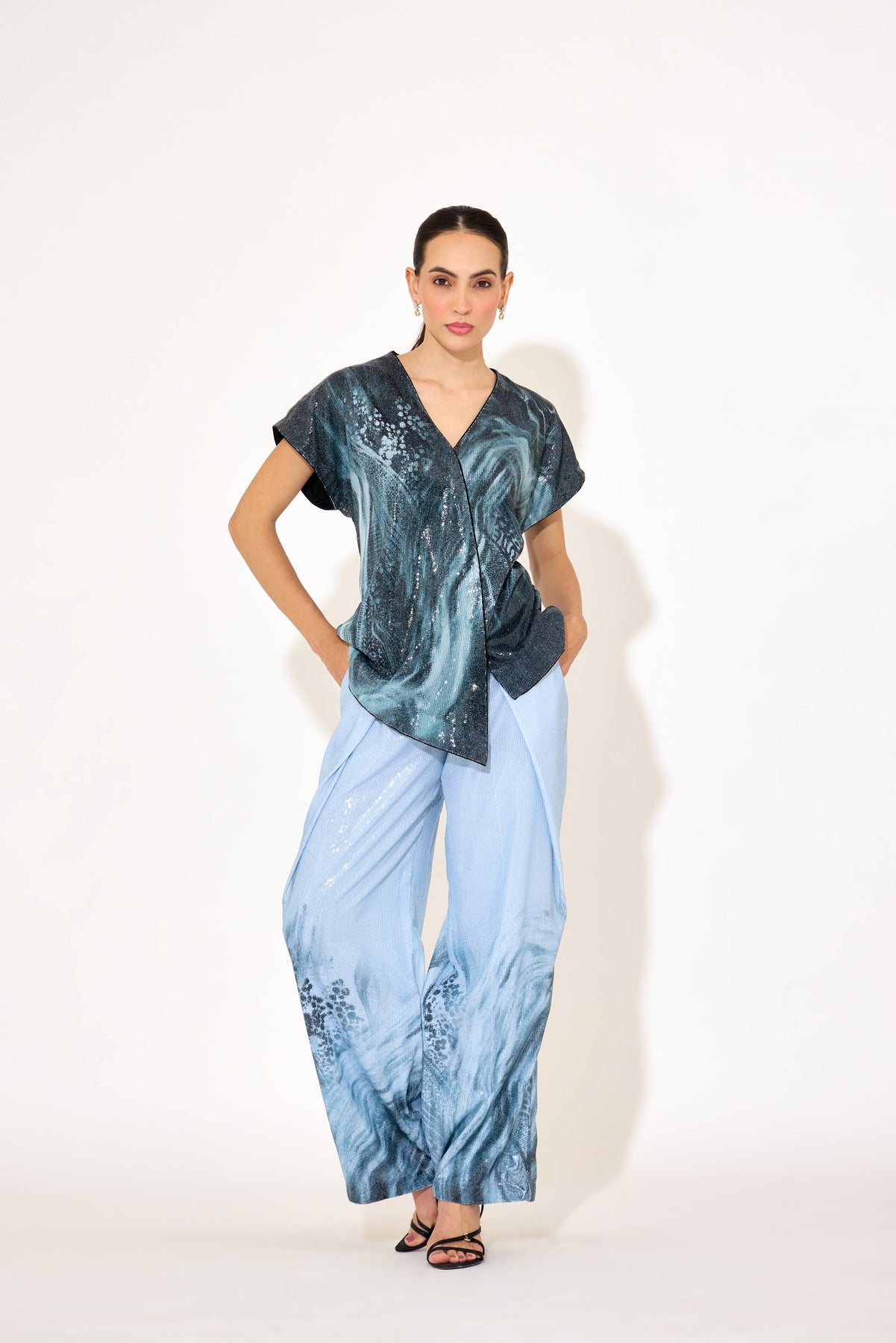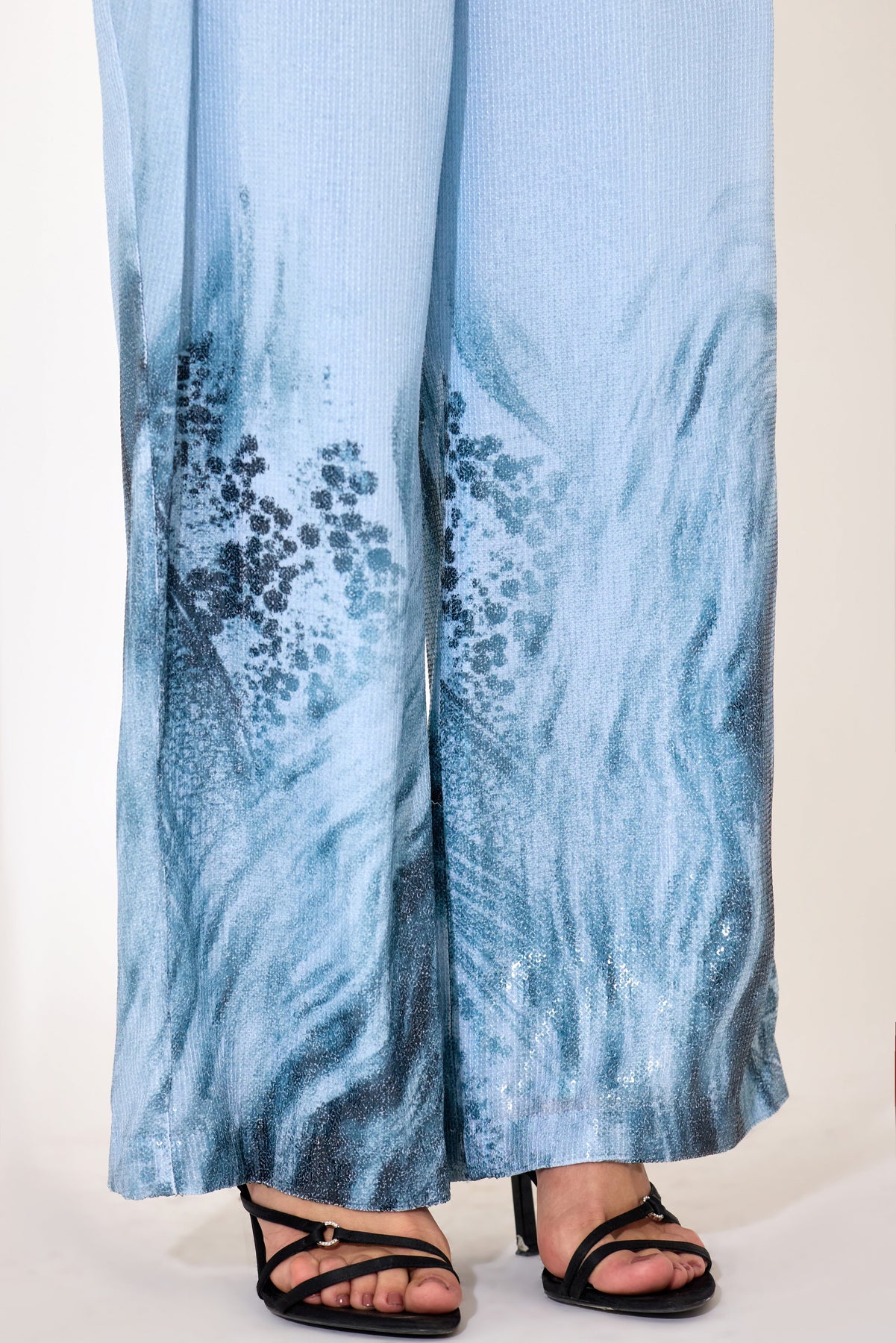 Elevate your wardrobe with these sky blue pleated pants crafted from luxurious sequin fabric. The abstract print adds a contemporary edge, while the pleated design ensures a flattering fit and graceful movement. Ideal for special occasions, this pant seamlessly combines shimmering texture with modern style, offering both comfort and standout elegance.