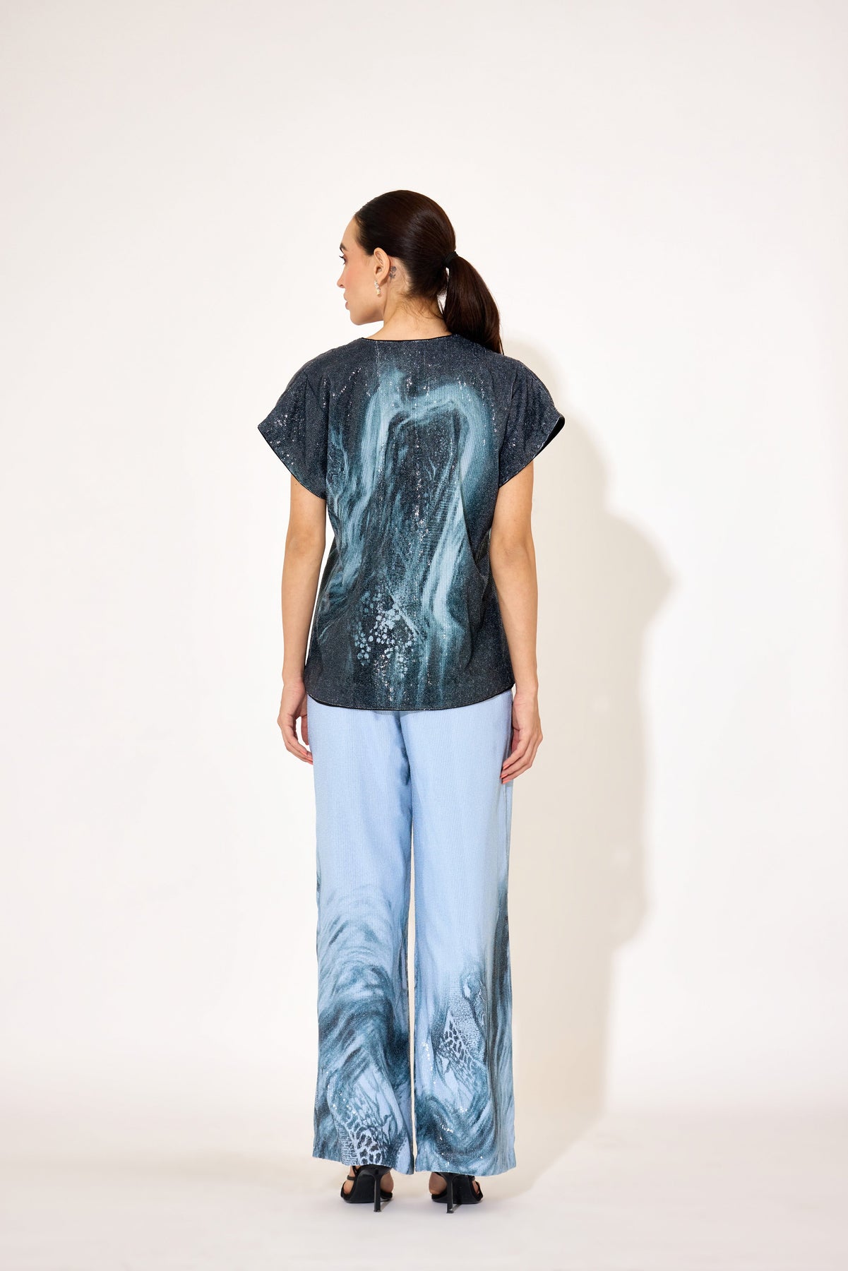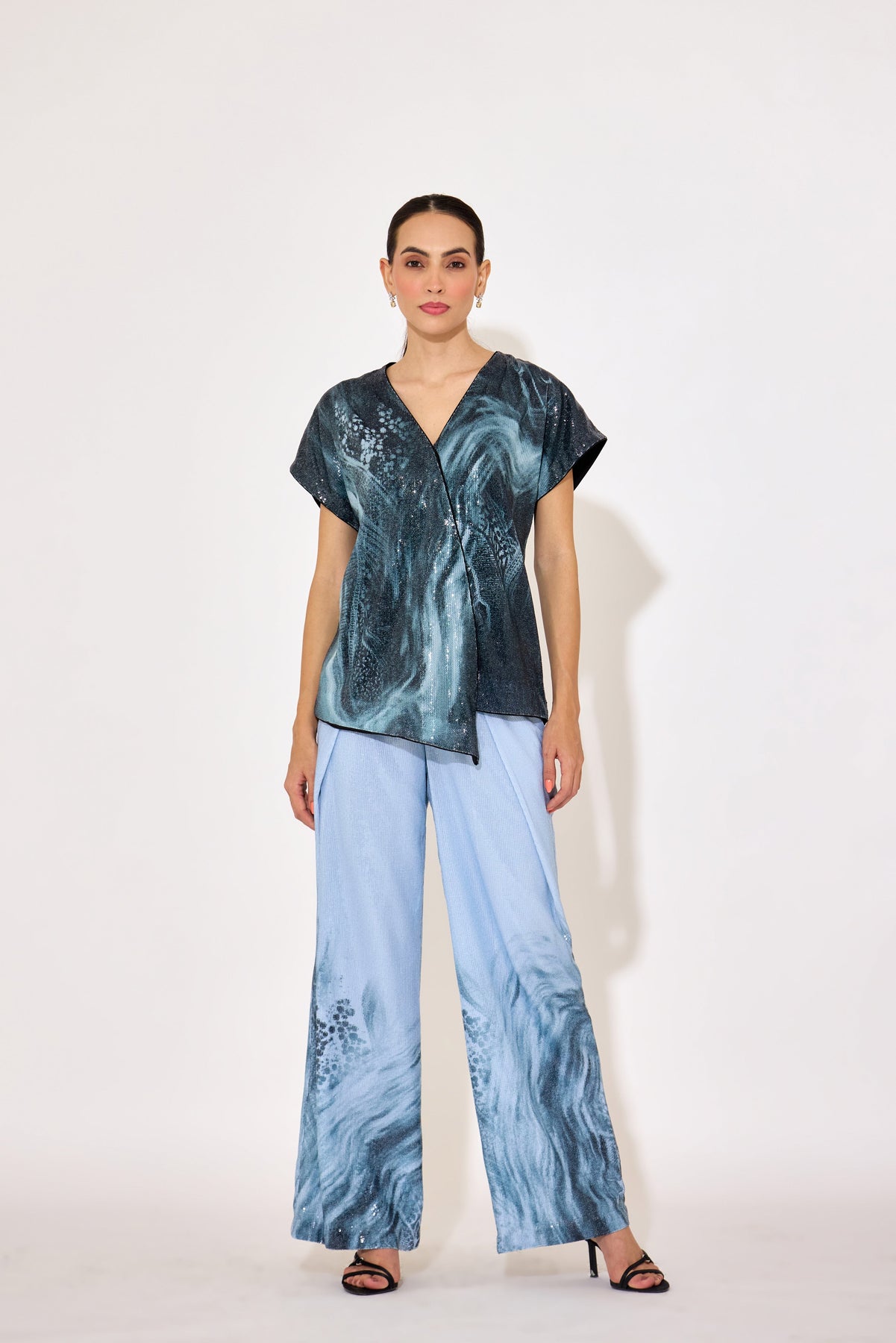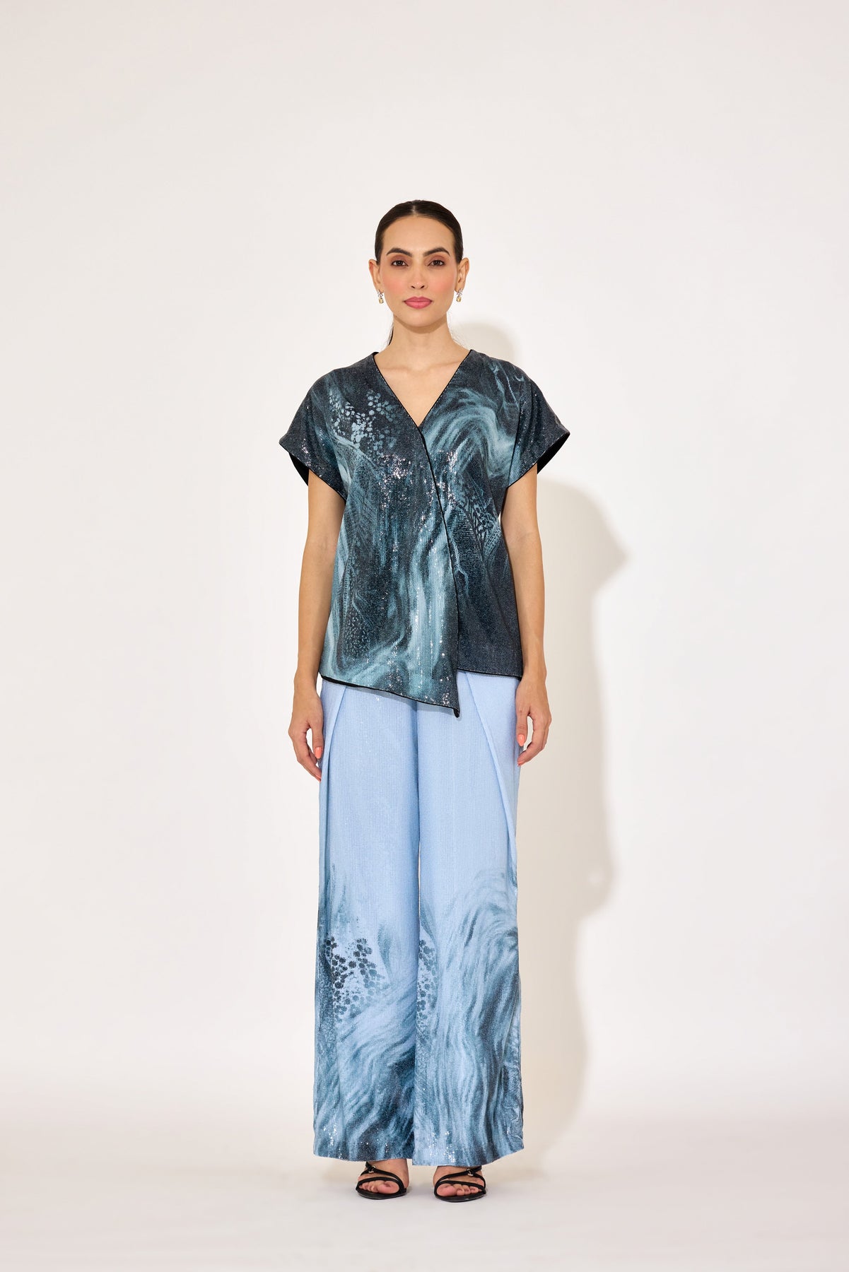 Elevate your wardrobe with these sky blue pleated pants crafted from luxurious sequin fabric. The abstract print adds a contemporary edge, while the pleated design ensures a flattering fit and graceful movement. Ideal for special occasions, this pant seamlessly combines shimmering texture with modern style, offering both comfort and standout elegance.
