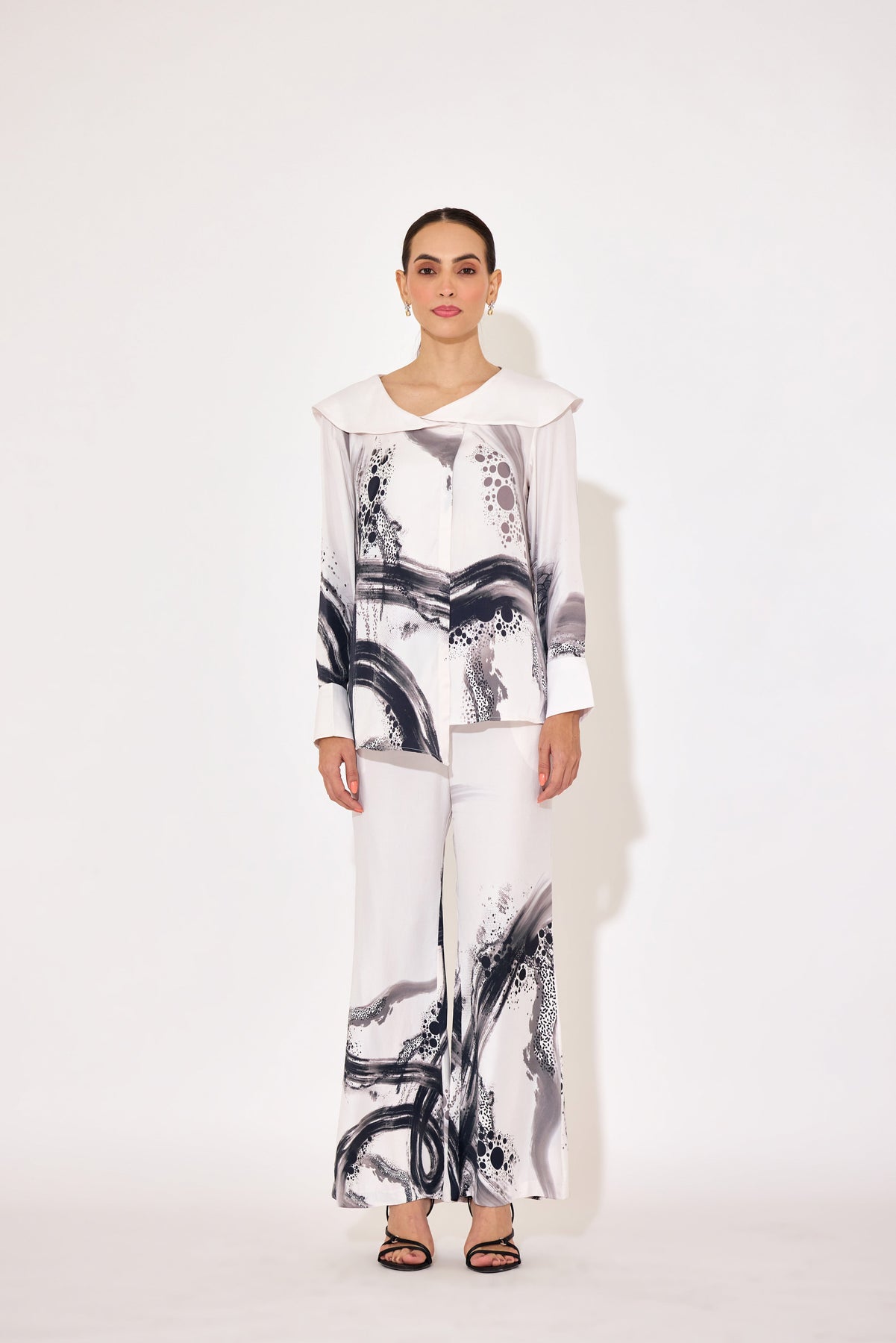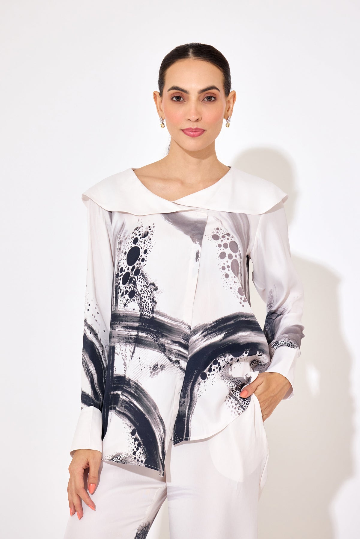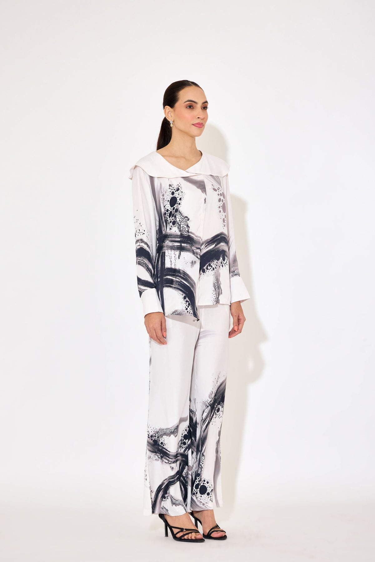 Elevate your wardrobe with this Ivory Printed Co-ord Set, designed for women who appreciate refined style and comfort. Featuring a distinctive abstract print, the set is enhanced by an asymmetrical shawl collar that adds a modern, sophisticated edge. Perfect for both casual and semi-formal occasions, this co-ord set balances contemporary design with effortless wearability.