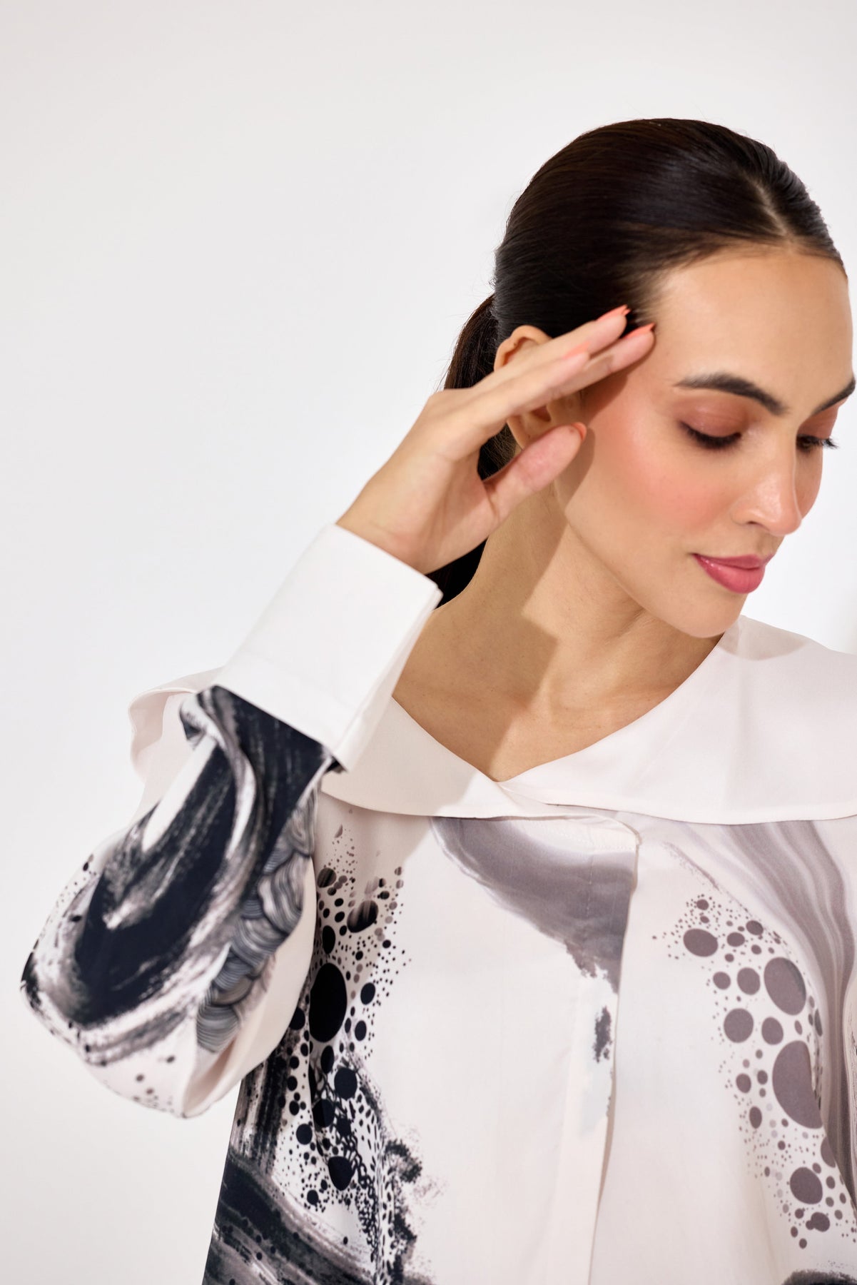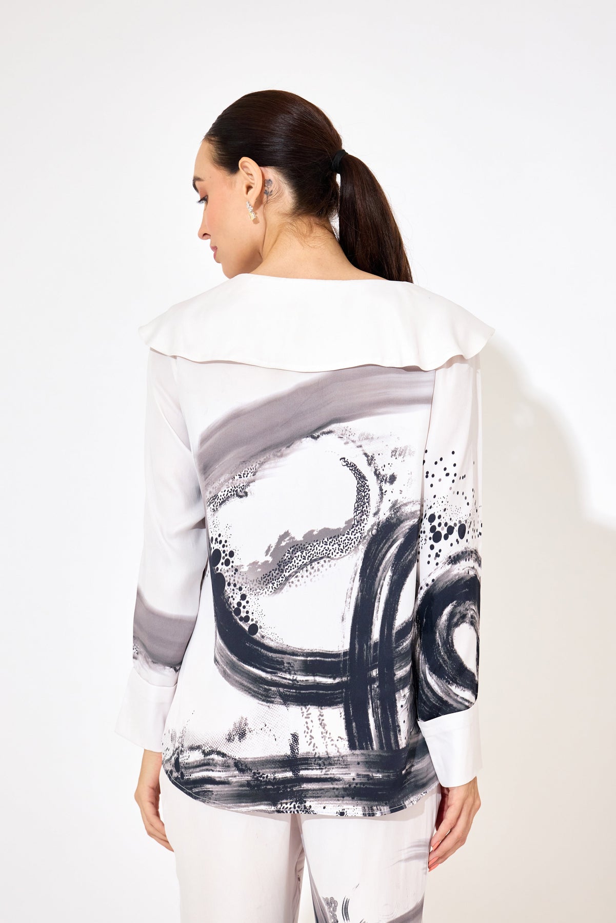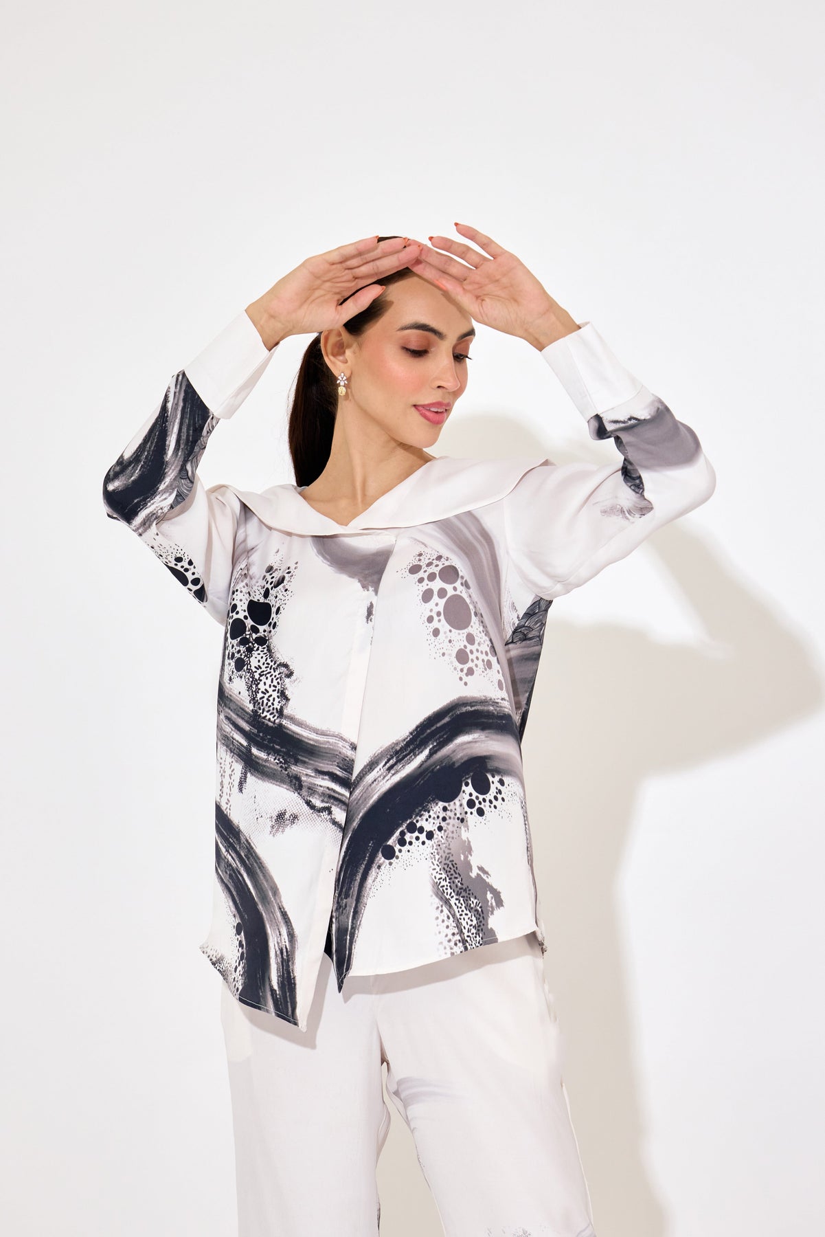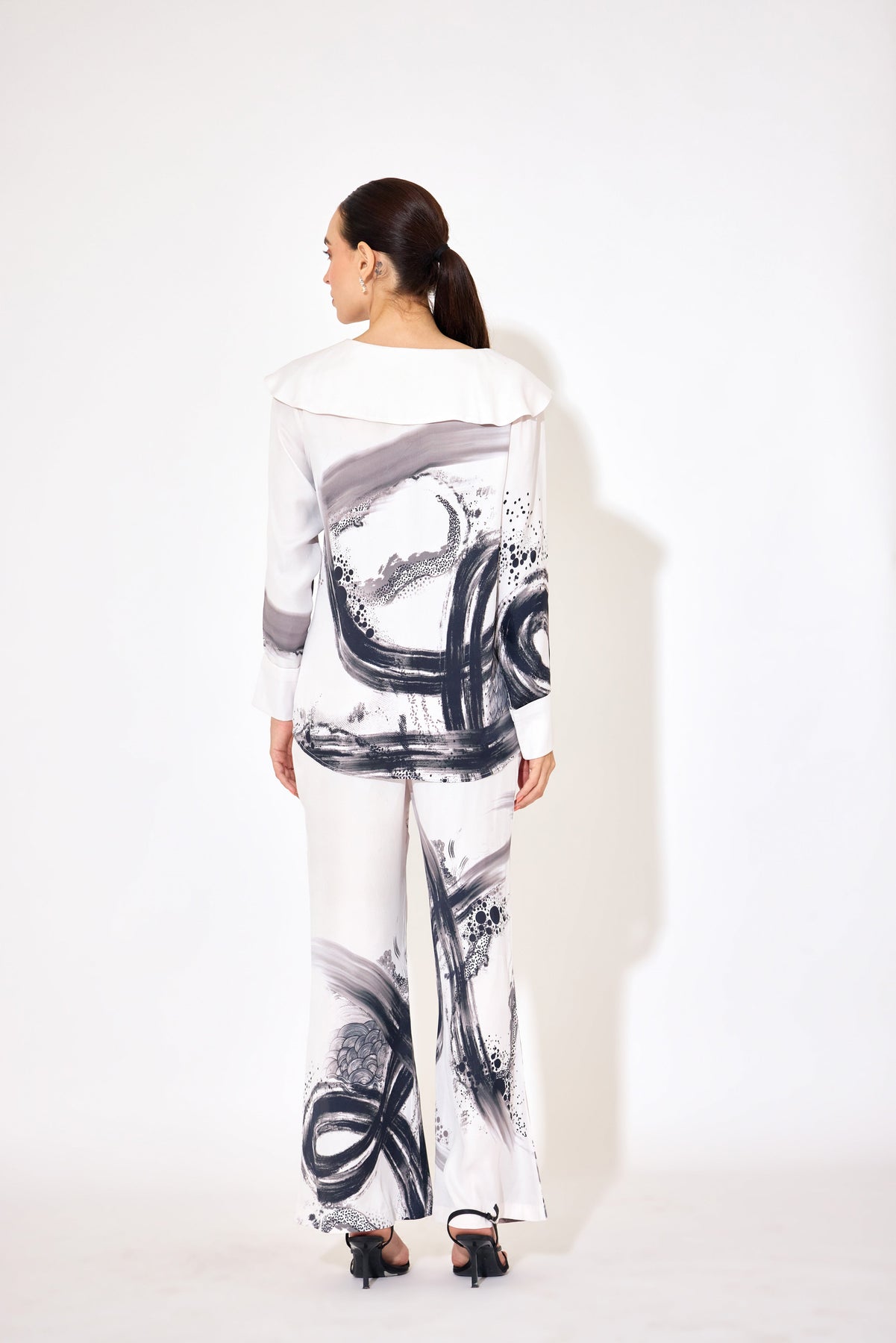 Elevate your wardrobe with this Ivory Printed Co-ord Set, designed for women who appreciate refined style and comfort. Featuring a distinctive abstract print, the set is enhanced by an asymmetrical shawl collar that adds a modern, sophisticated edge. Perfect for both casual and semi-formal occasions, this co-ord set balances contemporary design with effortless wearability.