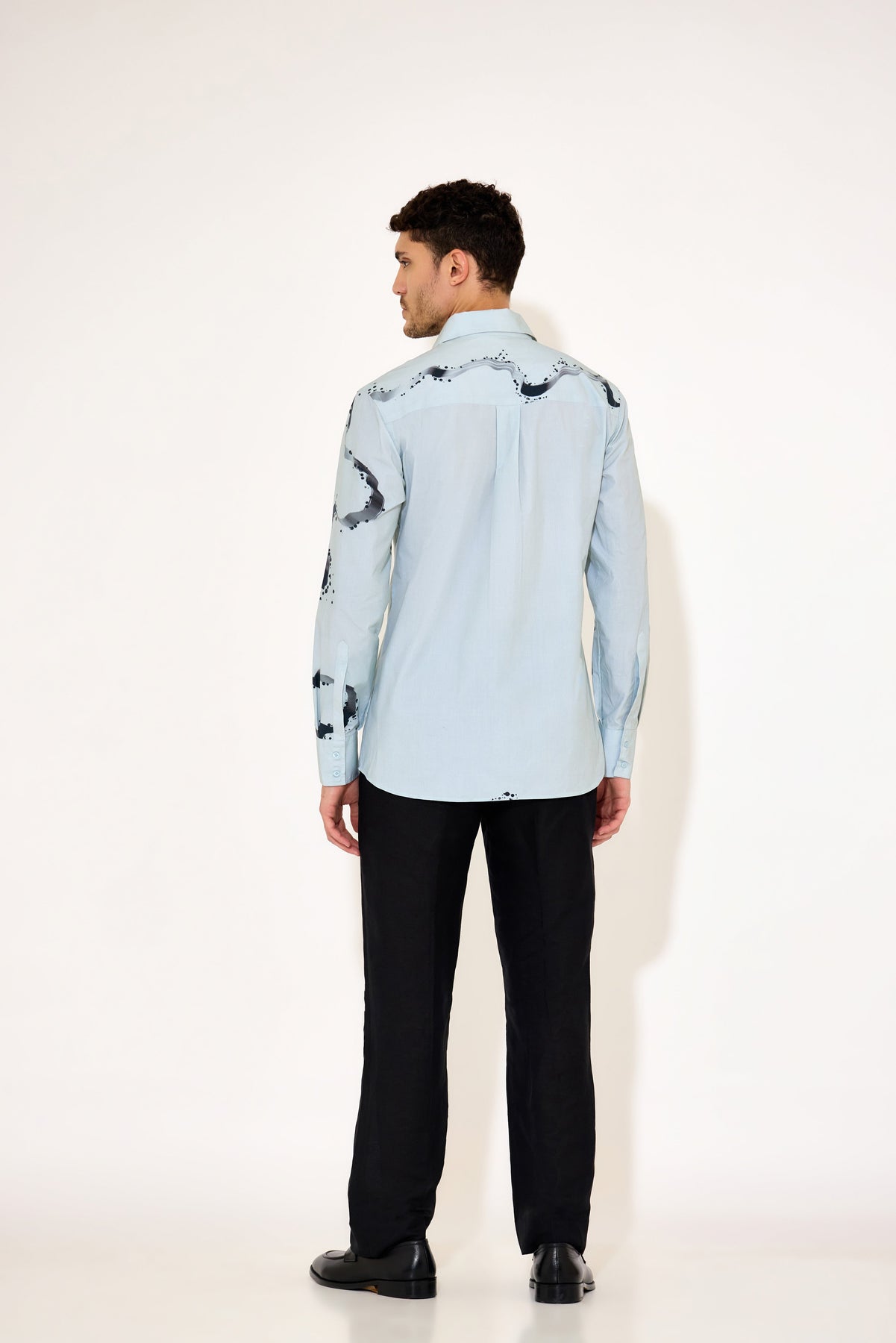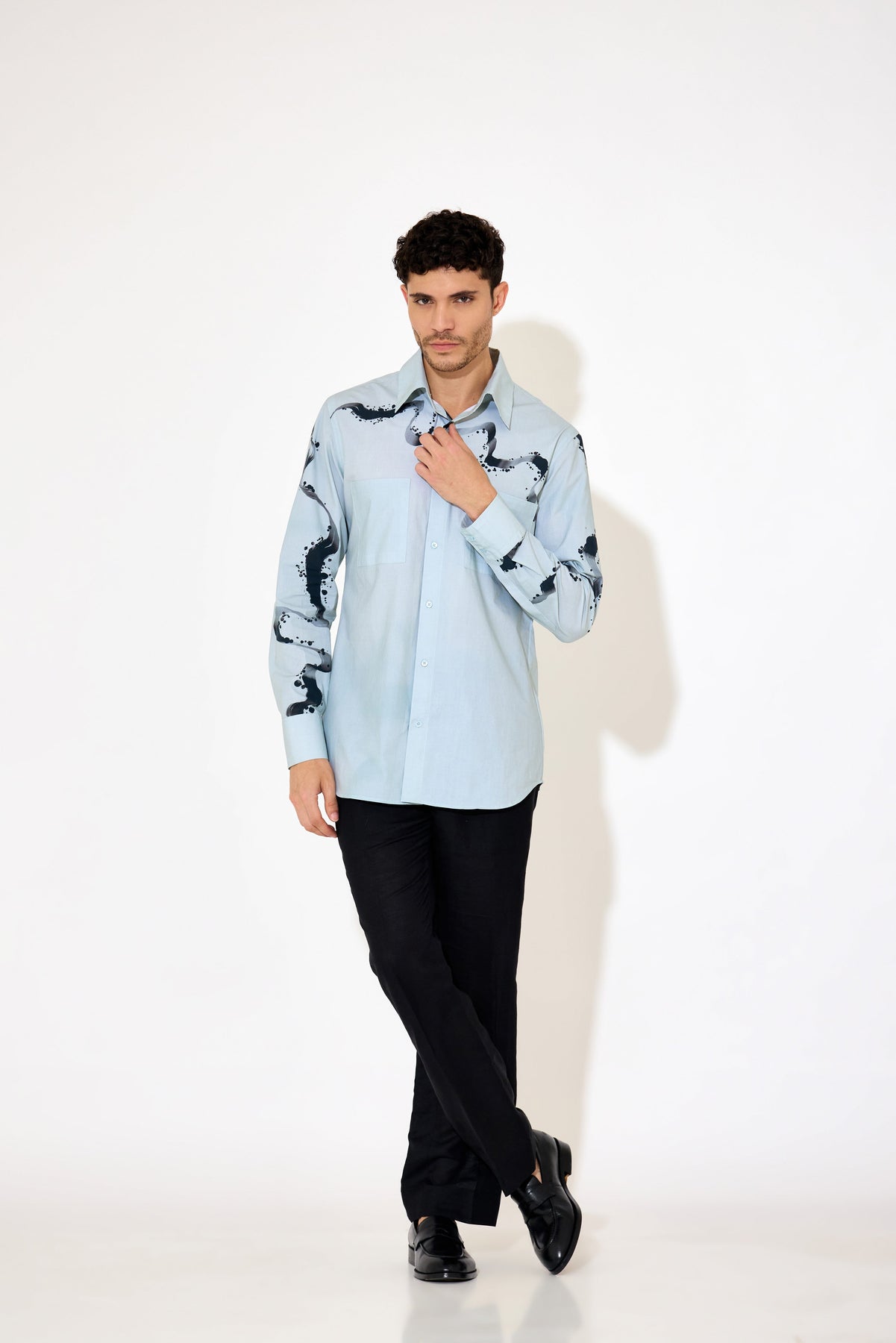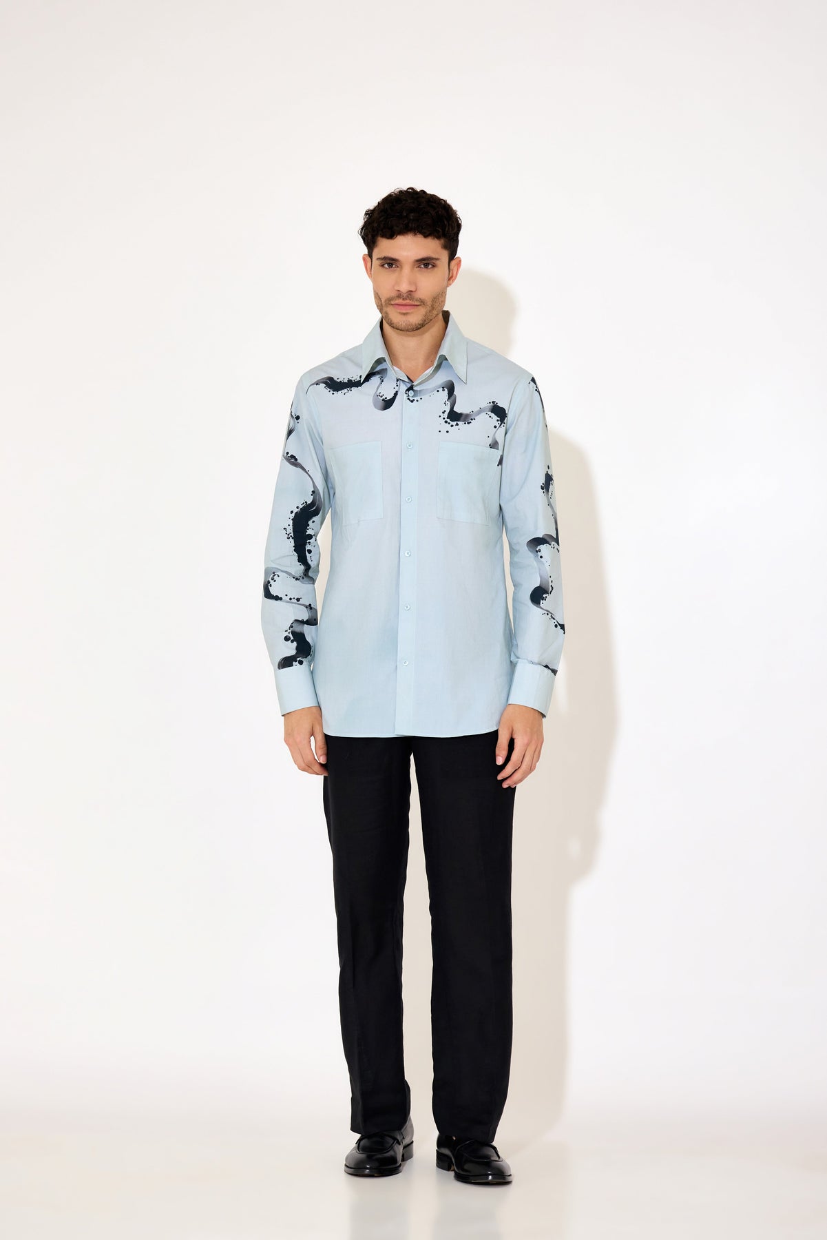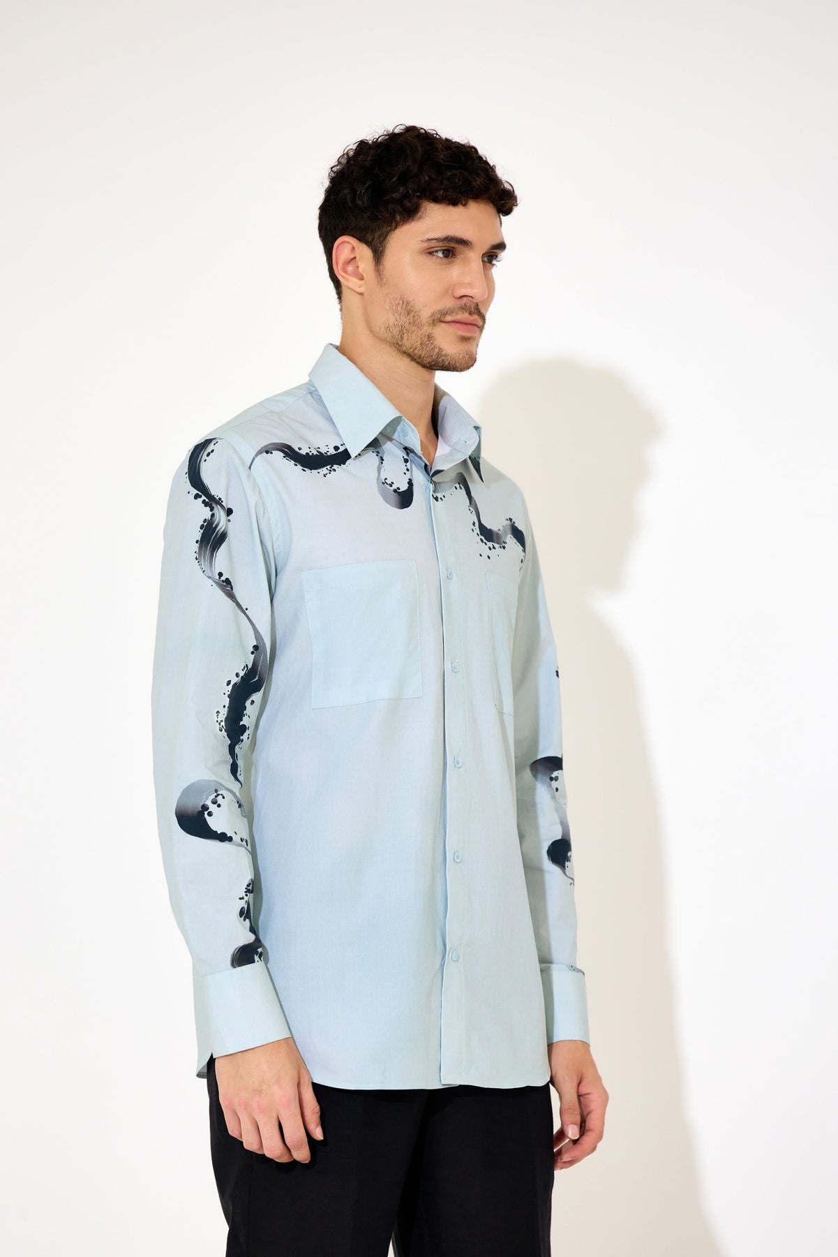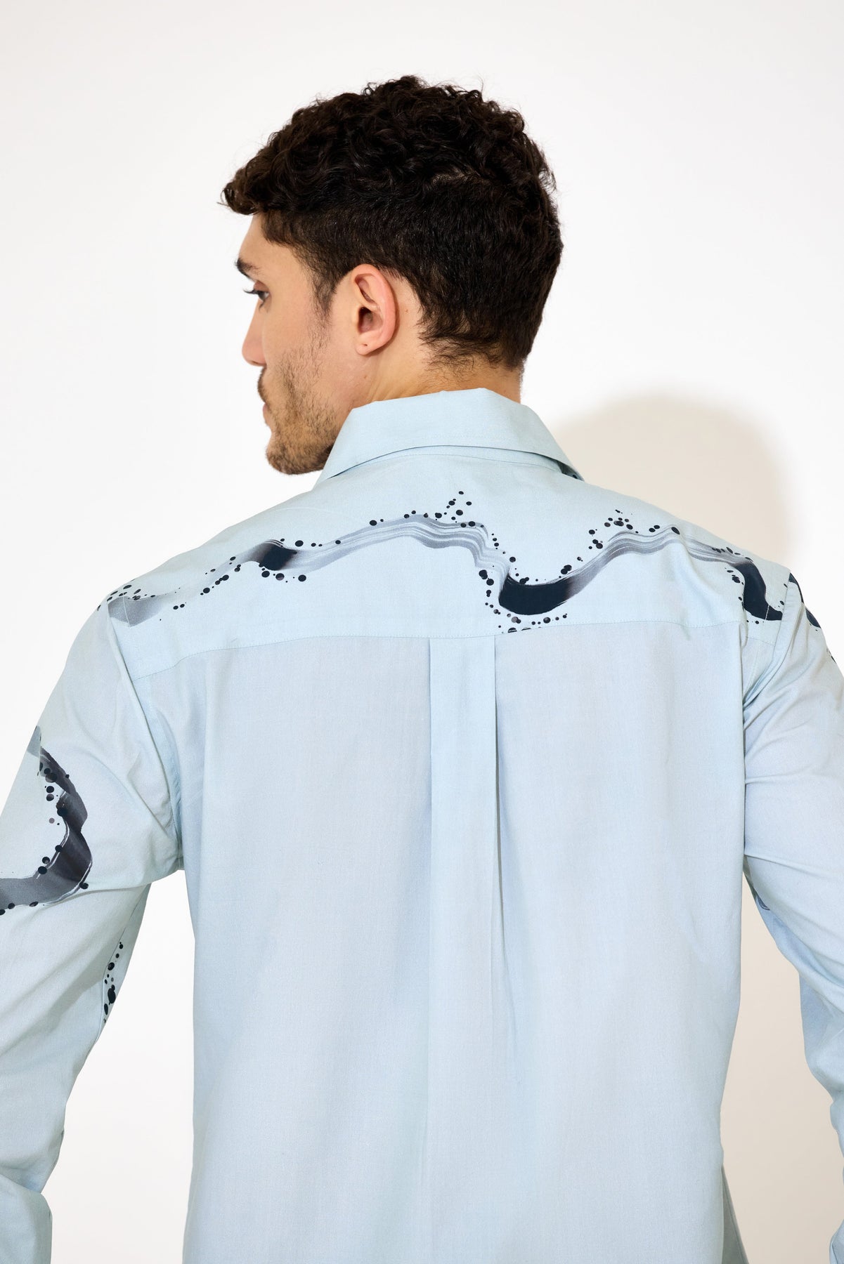 Crafted from smooth poplin fabric, this grey-blue shirt combines subtle hues with a modern abstract print for a refined look. Its lightweight texture ensures comfort and breathability, ideal for both office settings and casual outings. Designed for a tailored fit, it offers a polished silhouette that complements any professional wardrobe with understated style.