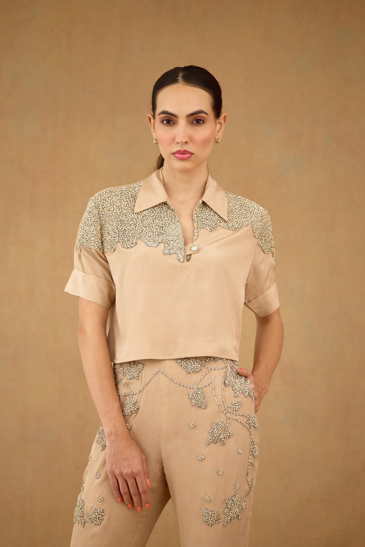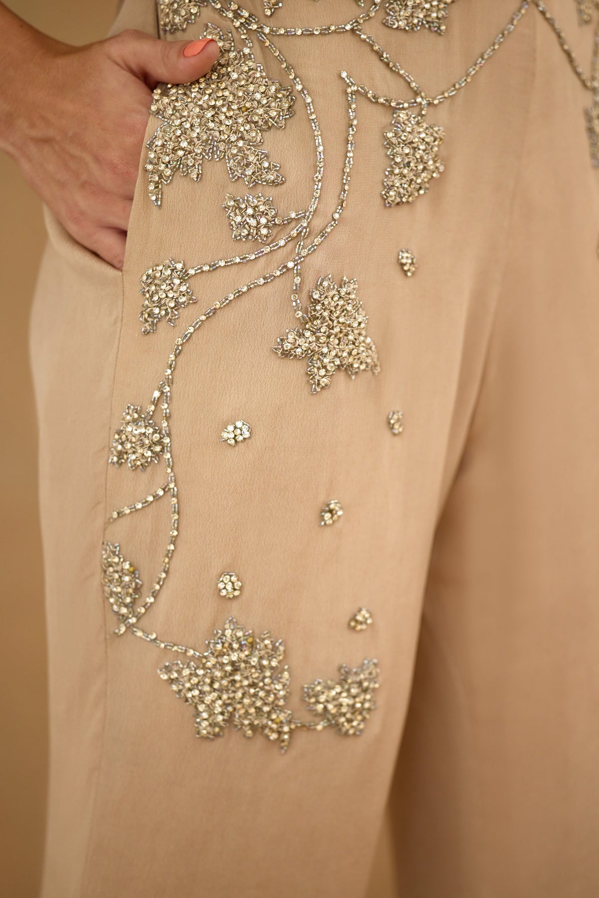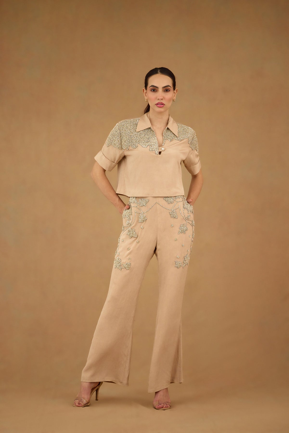Elevate your wardrobe with the Sand Brown Co-ord Set, expertly crafted for refined style and comfort. Featuring intricate stone and crystal embroidery, this set adds subtle sophistication to any occasion. Thoughtfully designed with practical pocket details, it combines elegance with functionality. Perfect for those who appreciate artisanal embellishment and tailored fits.