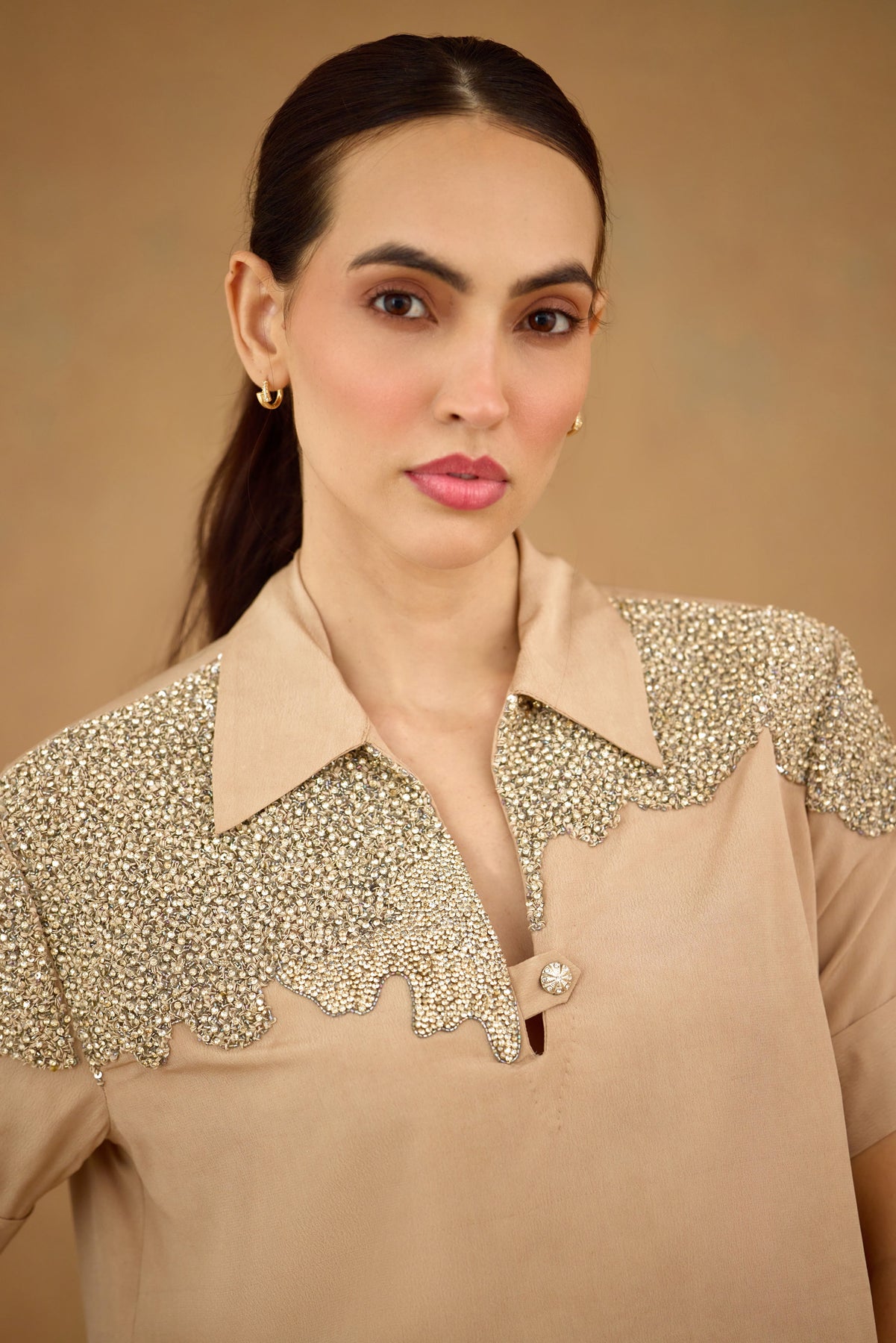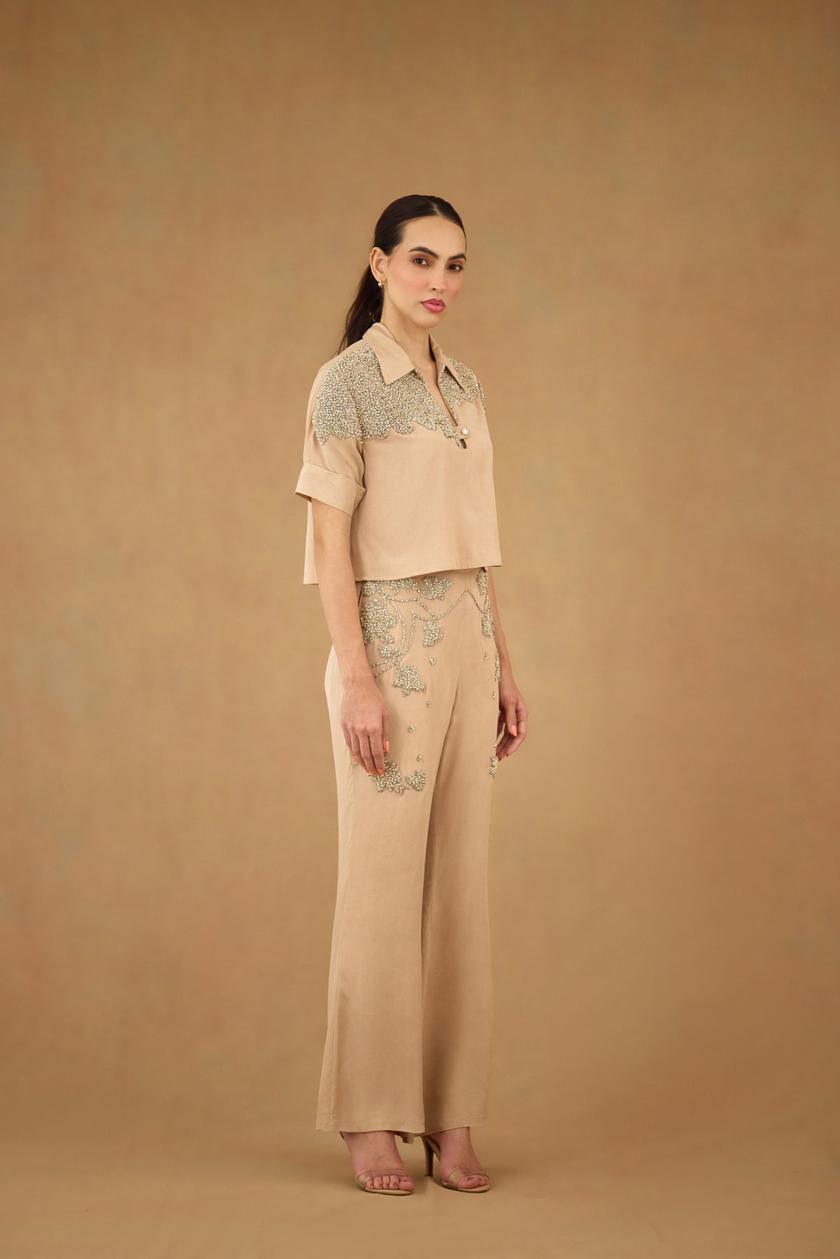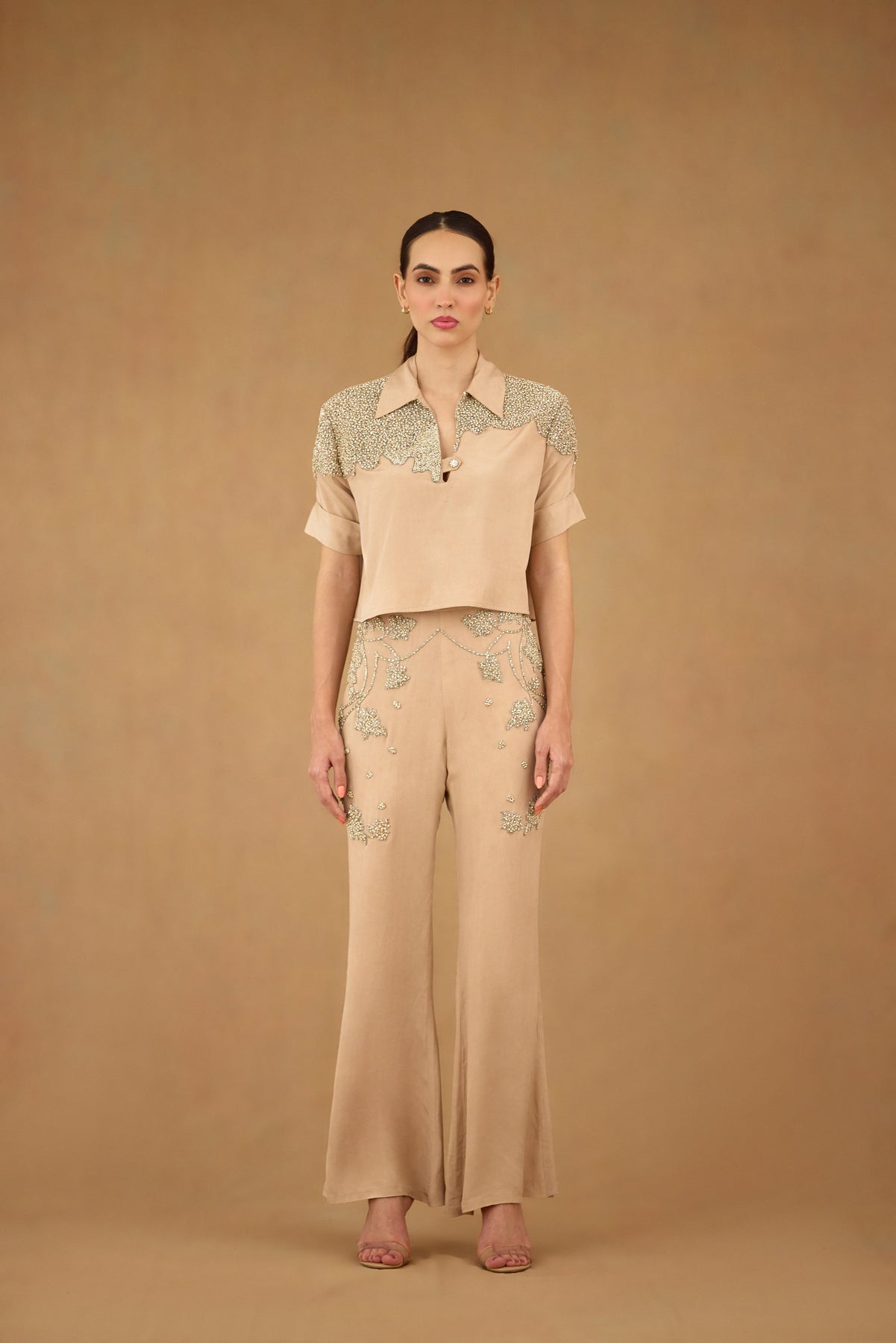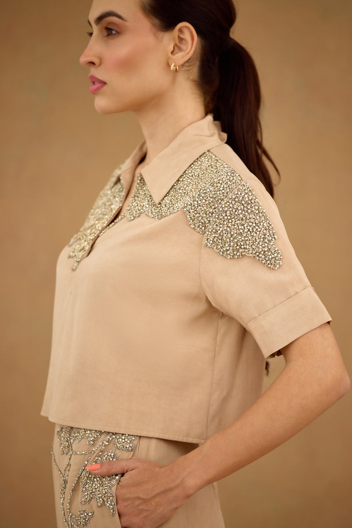 Elevate your wardrobe with the Sand Brown Co-ord Set, expertly crafted for refined style and comfort. Featuring intricate stone and crystal embroidery, this set adds subtle sophistication to any occasion. Thoughtfully designed with practical pocket details, it combines elegance with functionality. Perfect for those who appreciate artisanal embellishment and tailored fits.