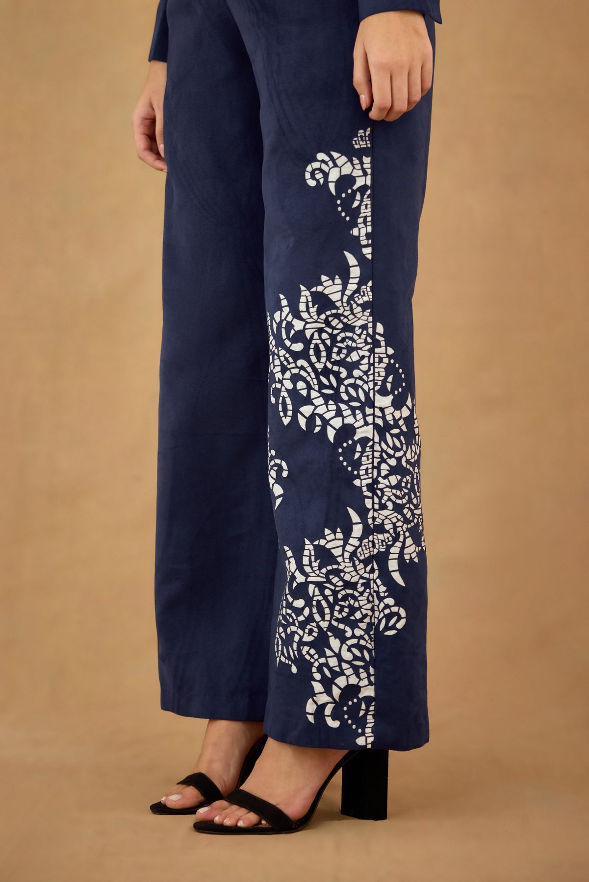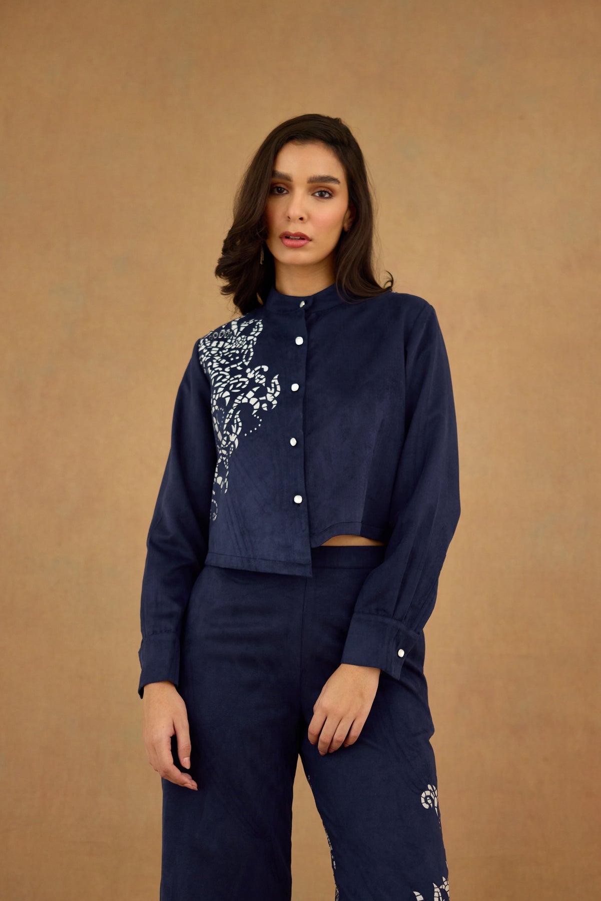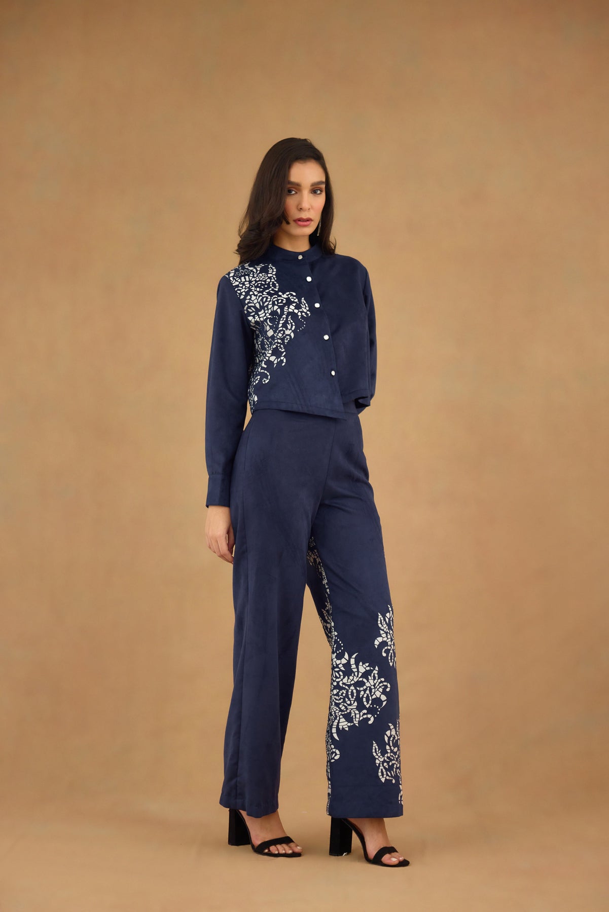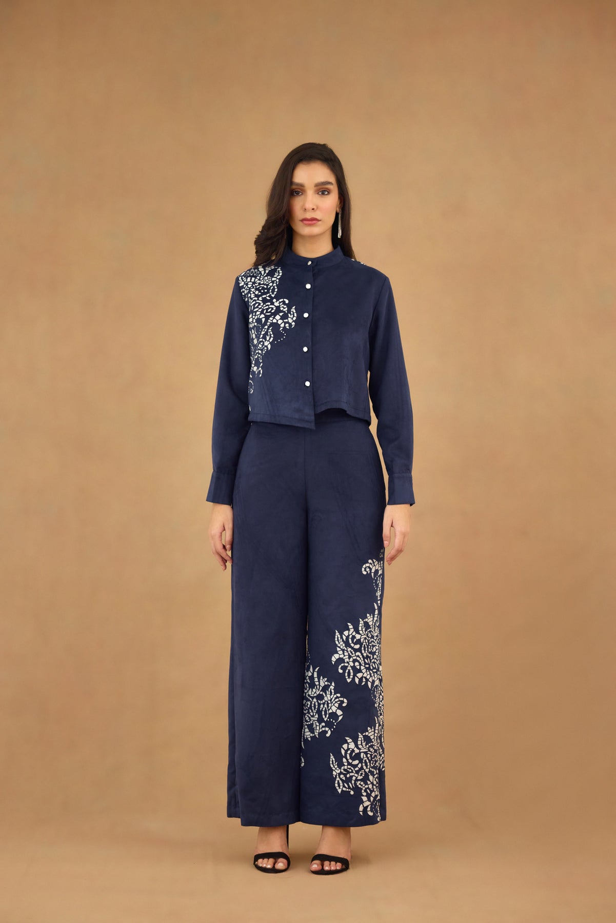 This navy blue suede co-ord set features a laser-cut design that adds subtle texture and sophistication. The front-open mandarin collar  with full sleeves offers a flattering silhouette, while the wide leg pants ensure comfort and a streamlined look. Perfect for polished, contemporary styling, this set combines refined craftsmanship with versatile wearability.
