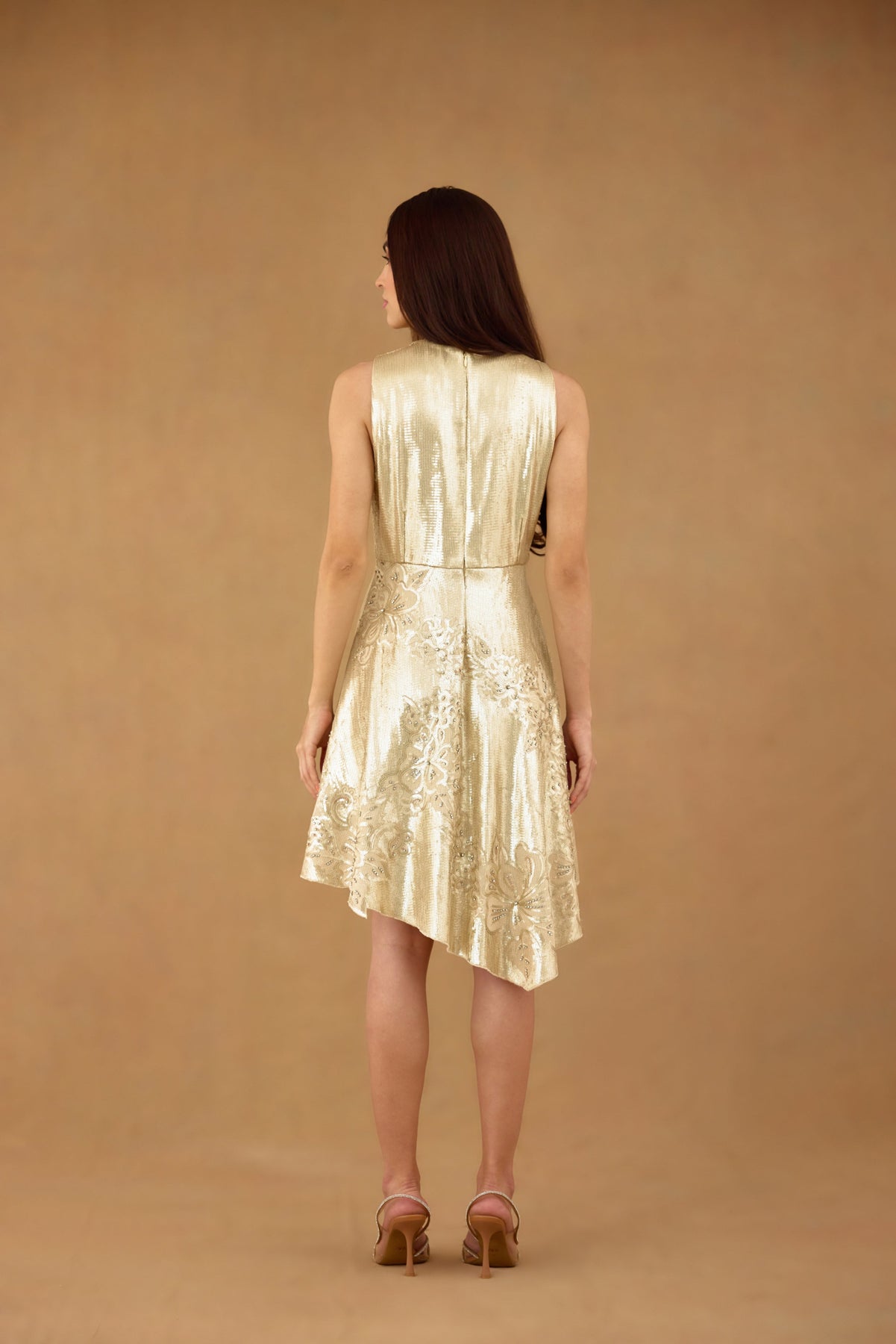 This gold sequin embroidered dress features a closed round neckline and an asymmetric flare, enhanced with intricate floral embroidery and delicate hand embellishments. Sleeveless by design, it offers both elegance and a flattering silhouette, making it an ideal choice for special occasions where refined craftsmanship and unique detailing are appreciated.