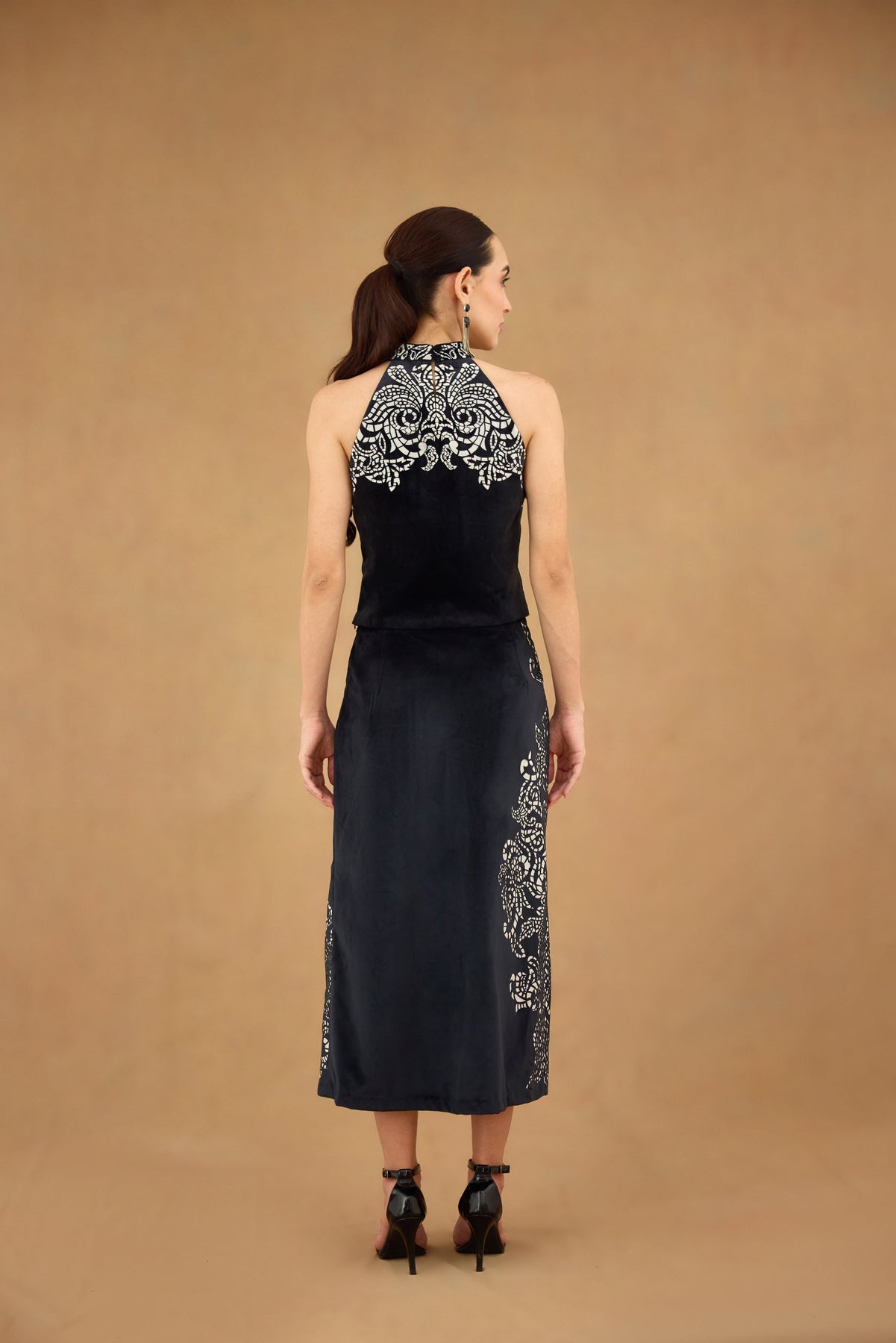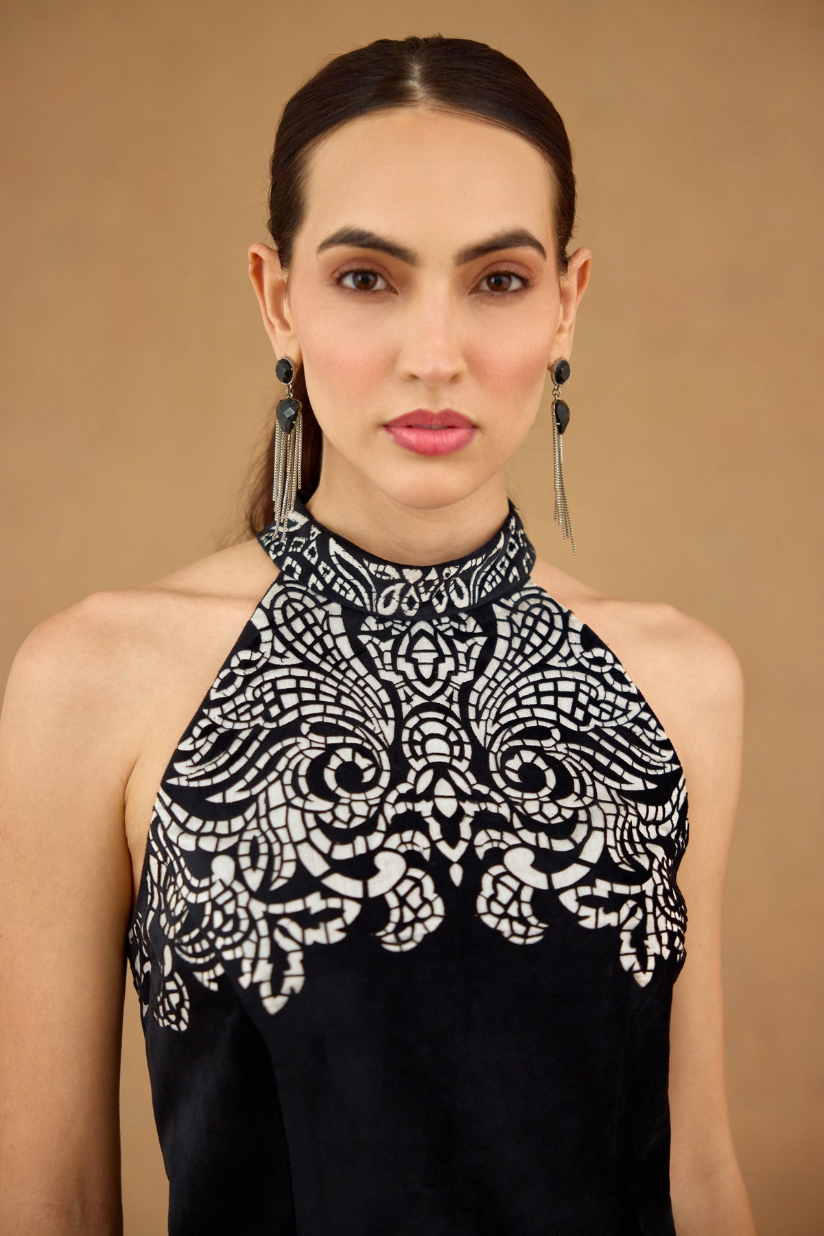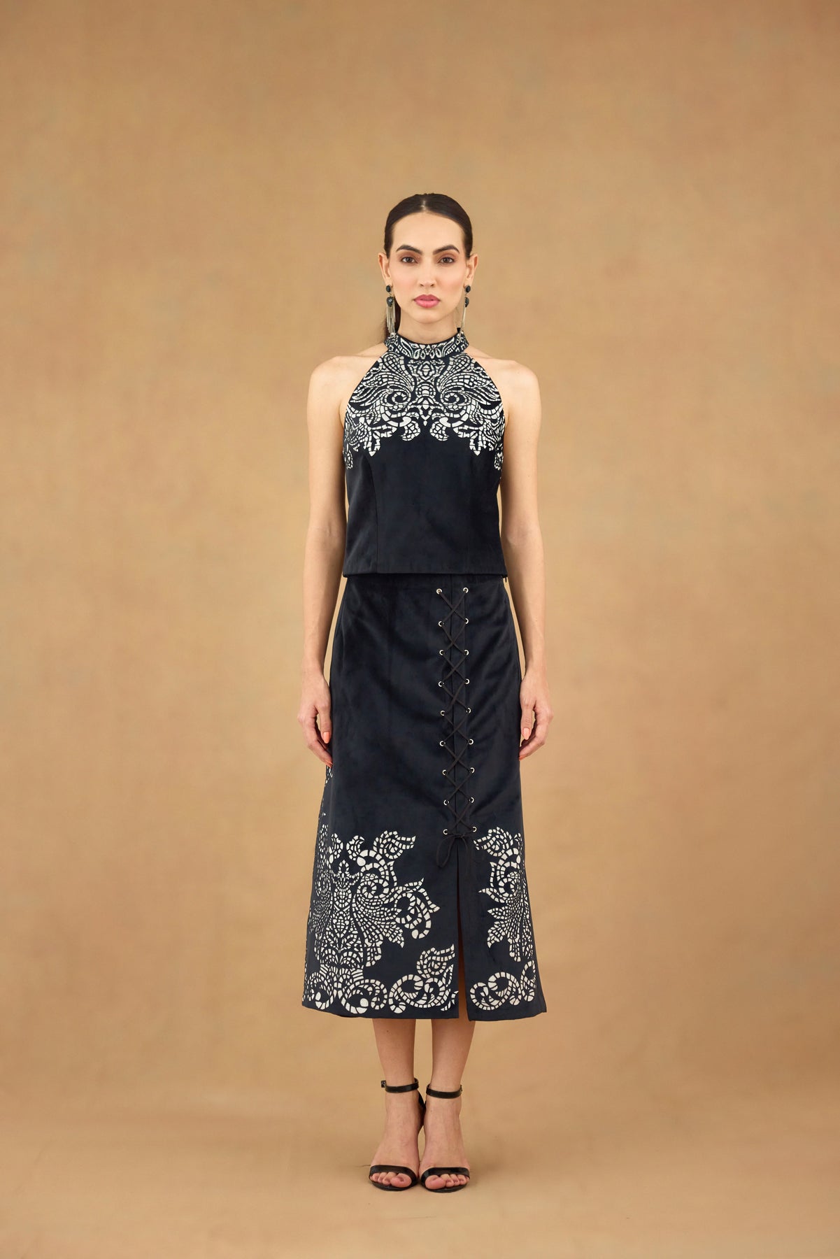 This black and white velvet set features a laser-cut sleeveless halter neck top paired with a matching skirt. The skirt is detailed with an eyelet tie-up on the front side, adding a refined, adjustable fit. Crafted for both style and comfort, this ensemble offers a sophisticated look ideal for contemporary occasions.