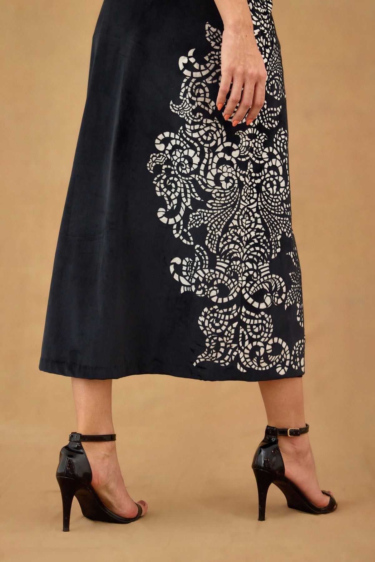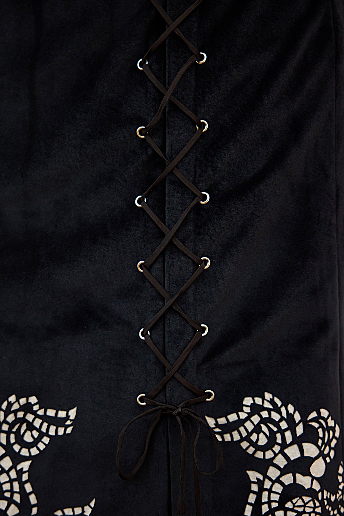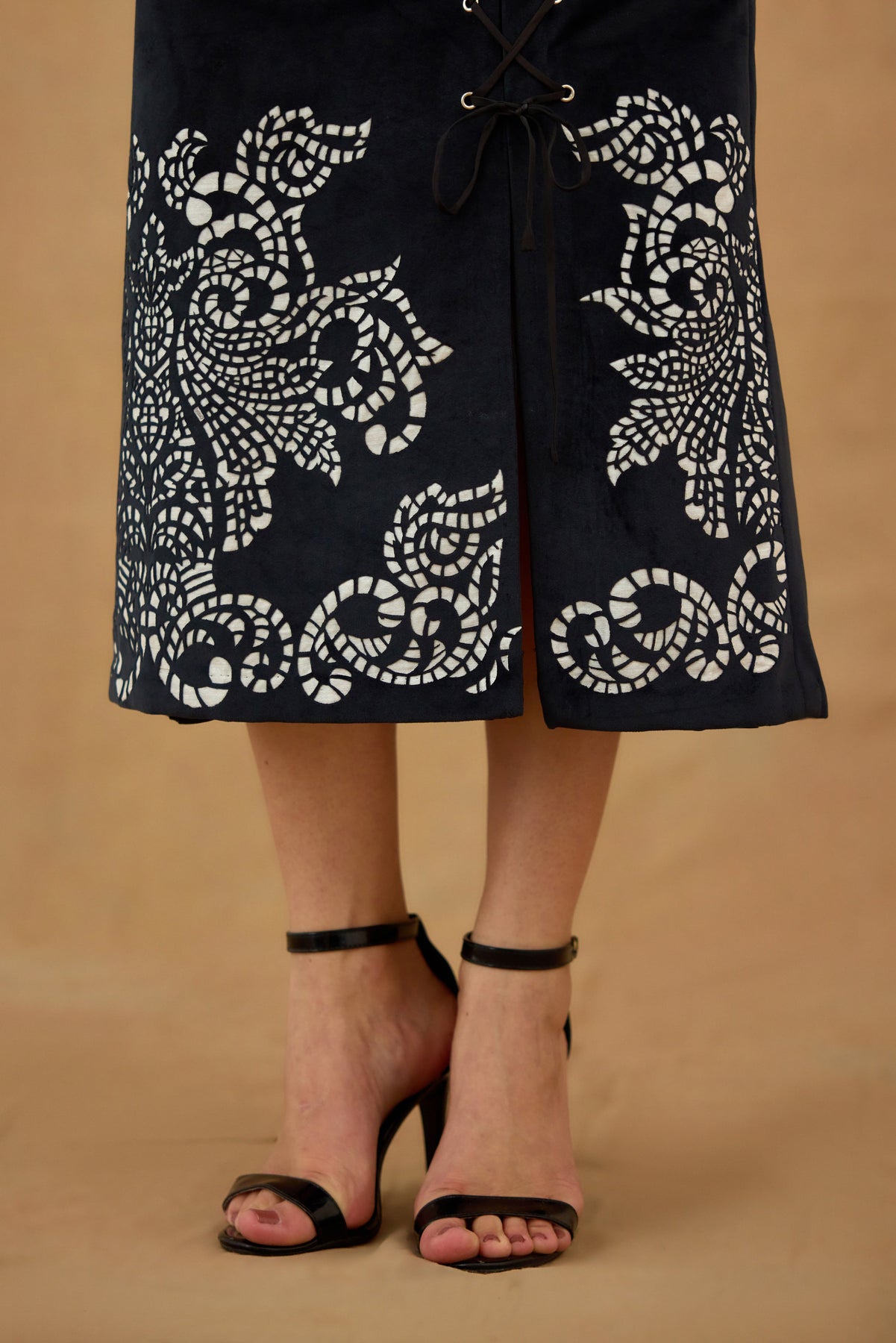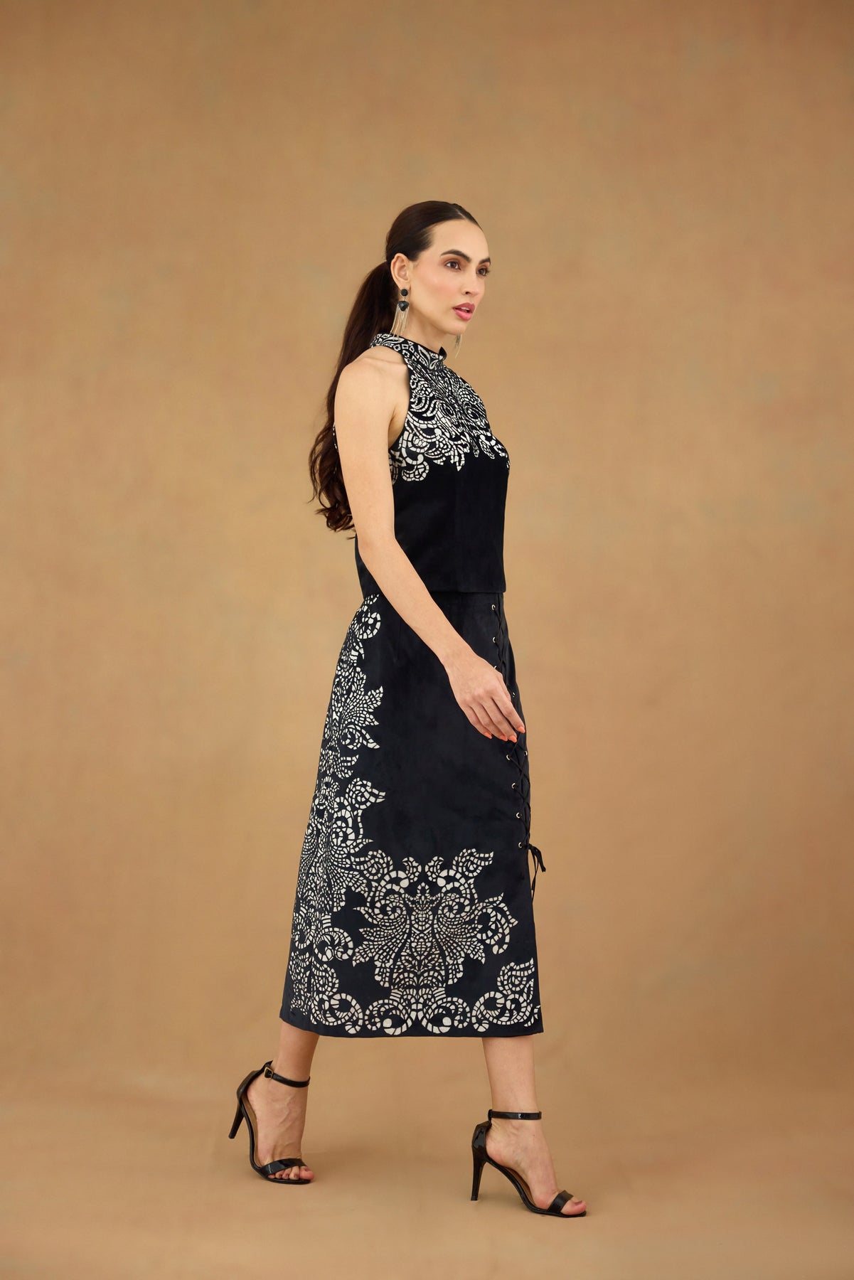 This black and white velvet set features a laser-cut sleeveless halter neck top paired with a matching skirt. The skirt is detailed with an eyelet tie-up on the front side, adding a refined, adjustable fit. Crafted for both style and comfort, this ensemble offers a sophisticated look ideal for contemporary occasions.