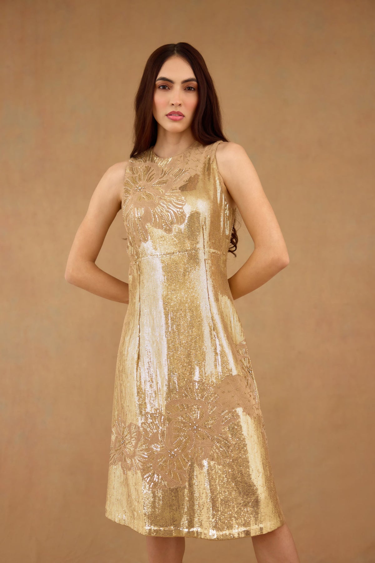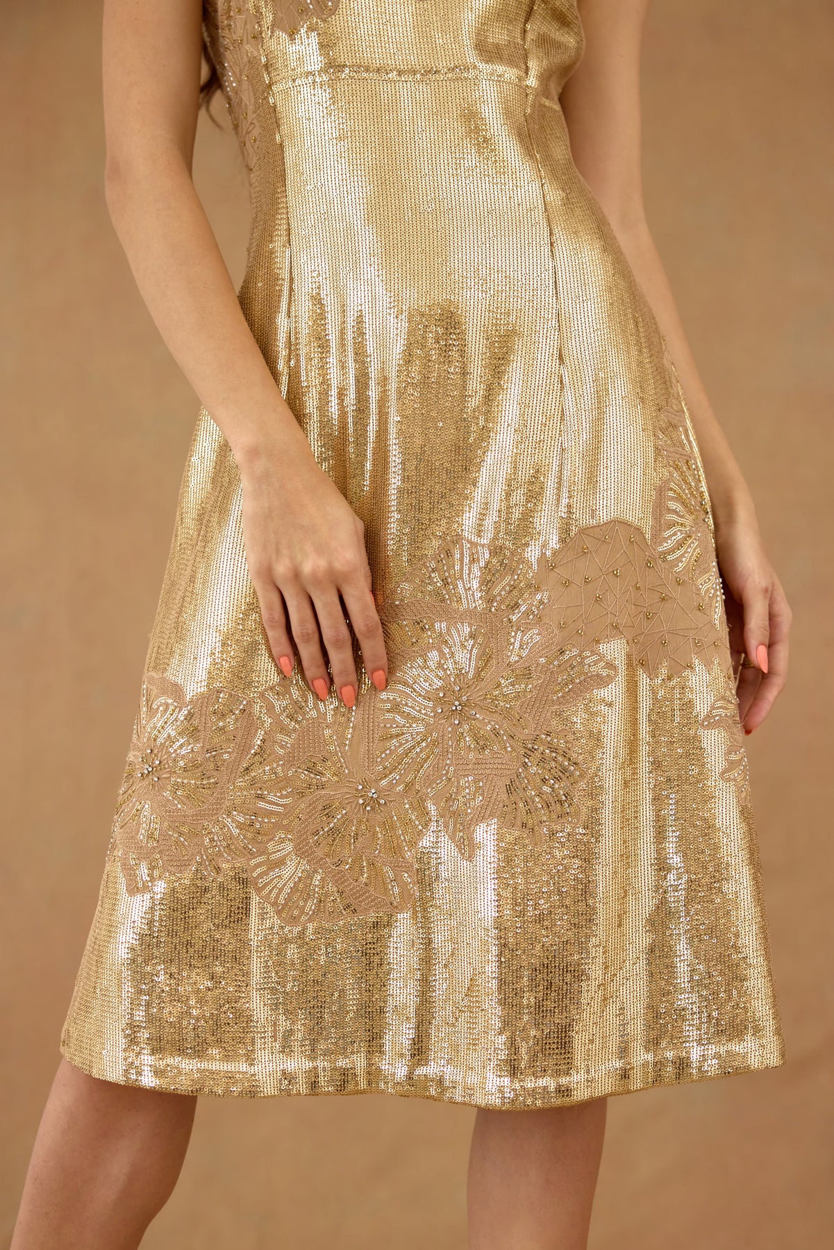 This bronze gold sleeveless dress features a closed neckline and a midi length, enhanced by intricate floral embroidery and delicate hand embellishments. The detailed craftsmanship adds a refined texture and subtle shimmer, making it a sophisticated choice for formal occasions. Designed to flatter, its elegant silhouette perfectly balances classic style with artisanal detail.