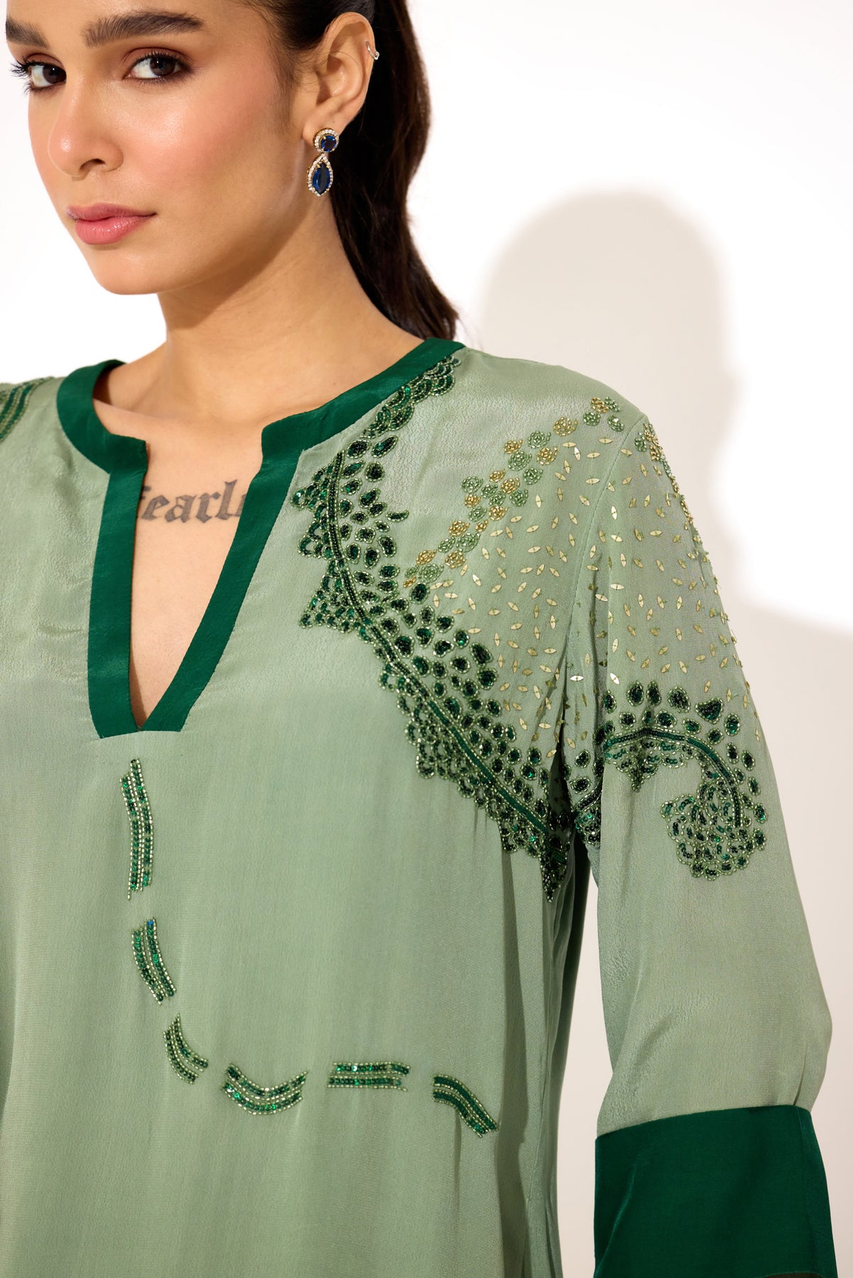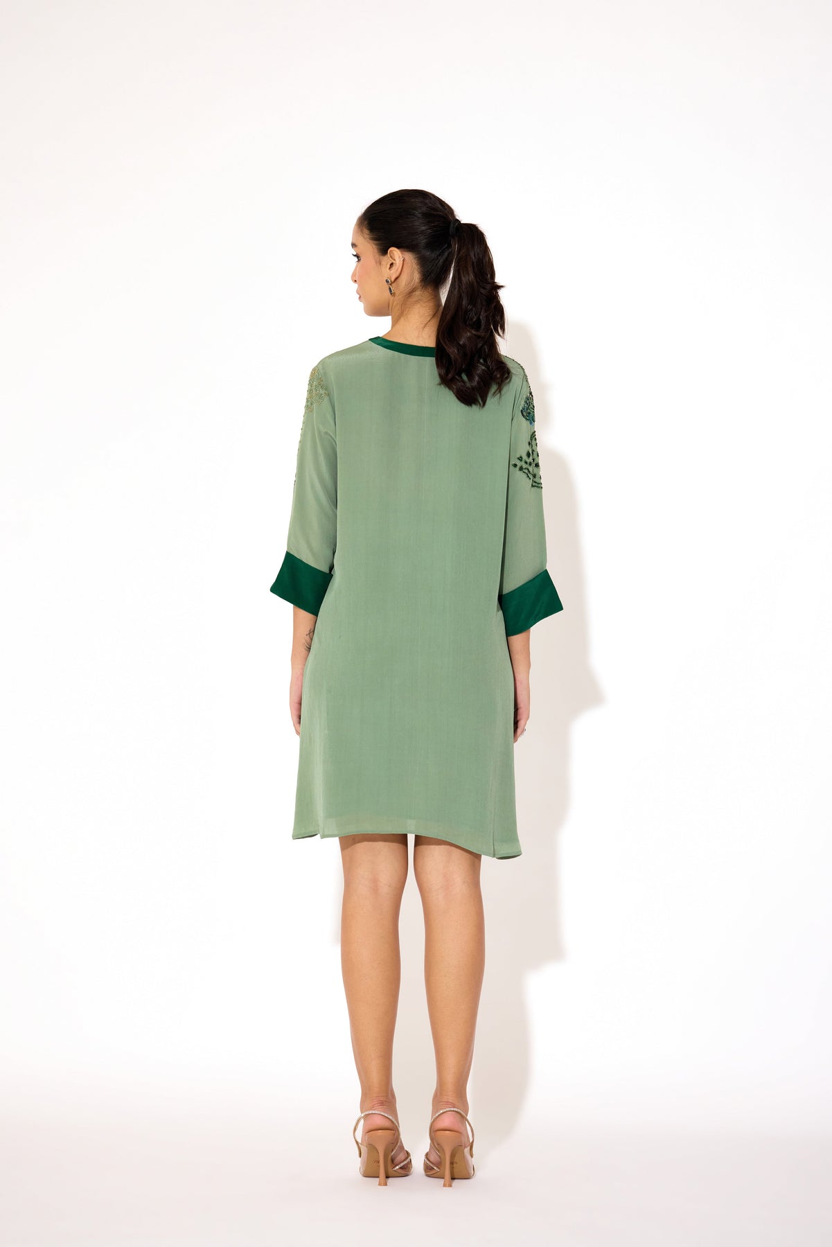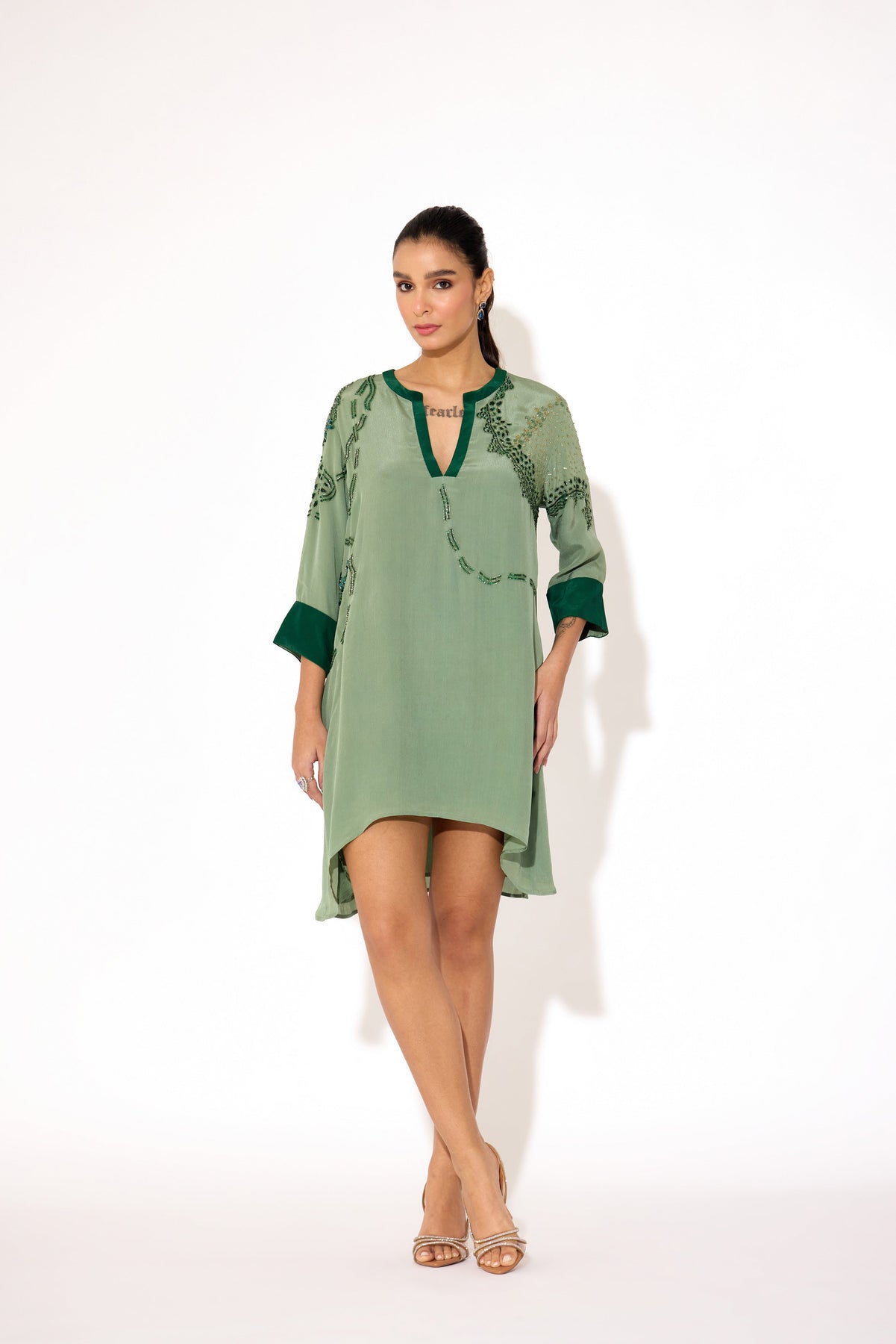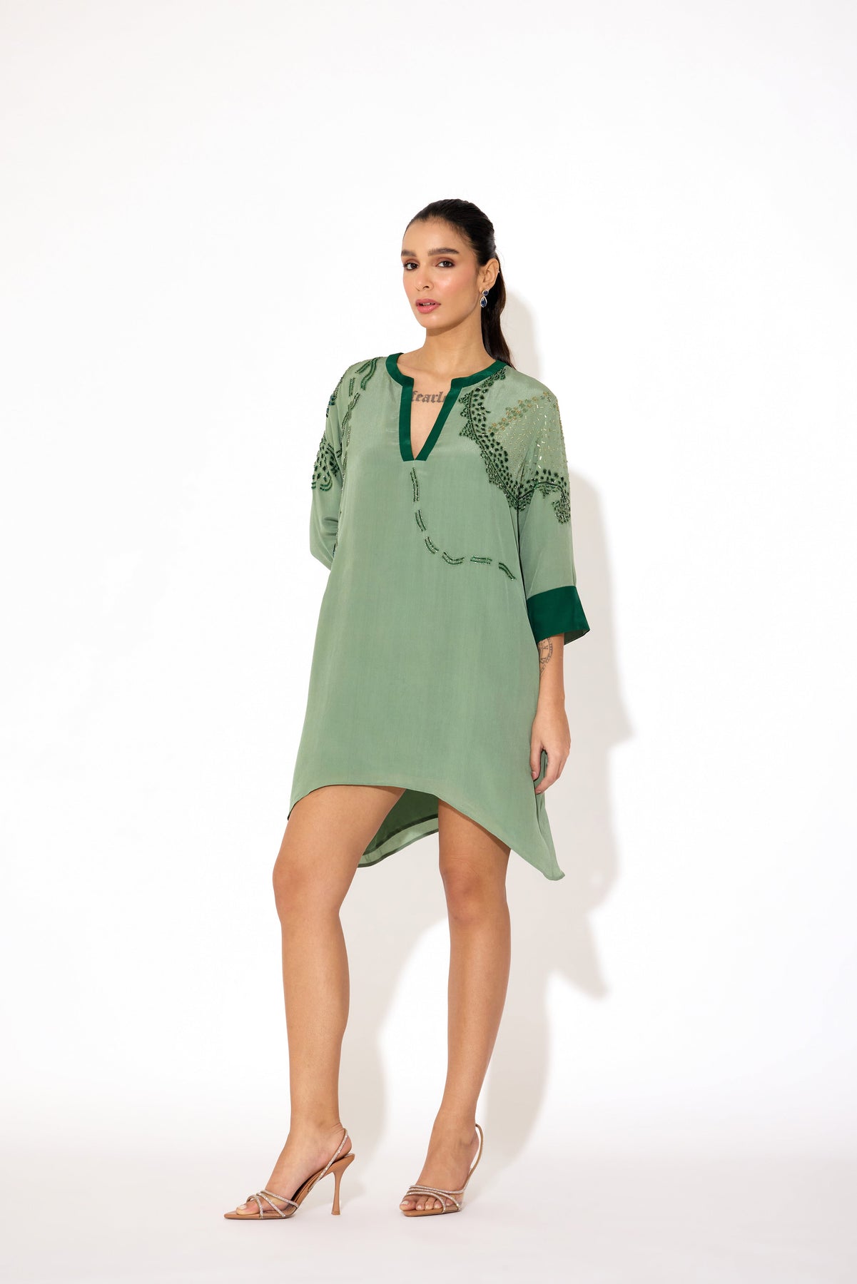 This green kaftan-style dress offers a relaxed fit that ensures comfort without compromising style. Expertly embellished, it adds a subtle yet elegant touch, making it ideal for occasions where ease and refinement are equally important. Its flowing silhouette flatters various body types, blending traditional charm with contemporary appeal.
